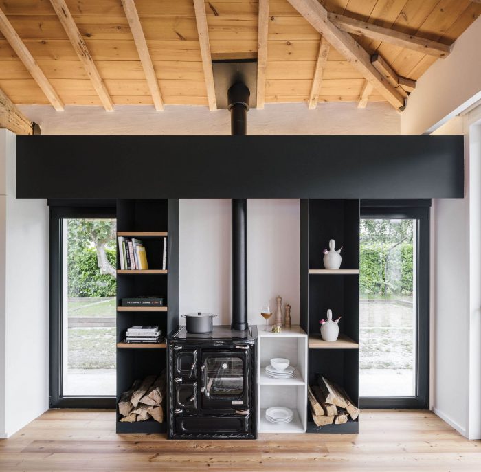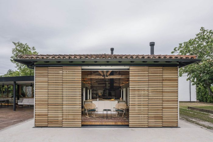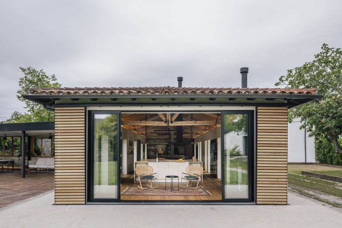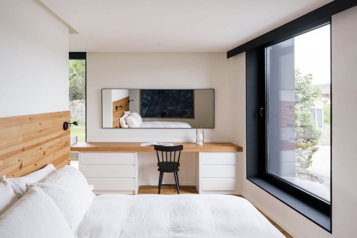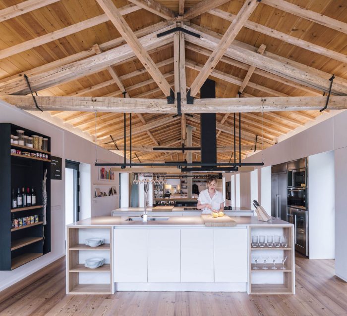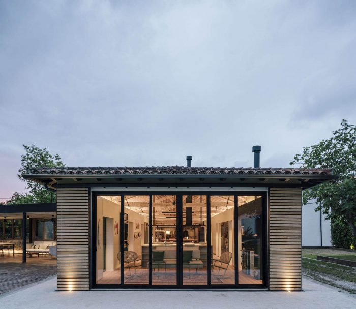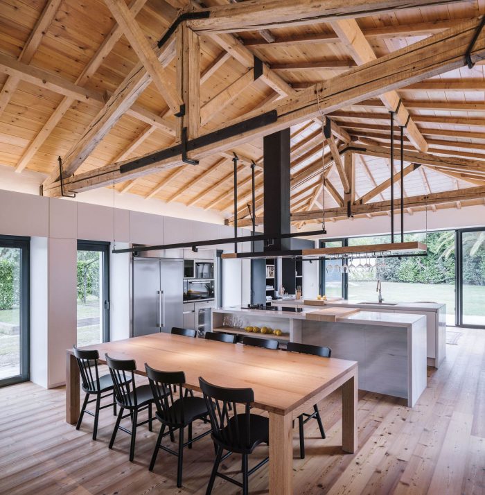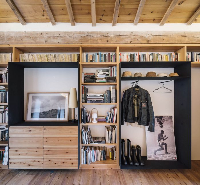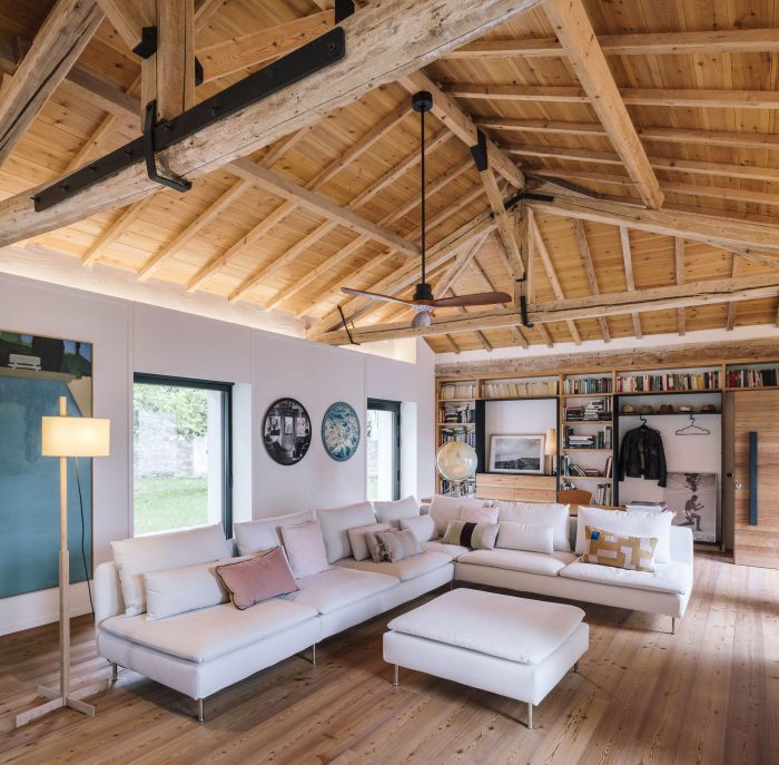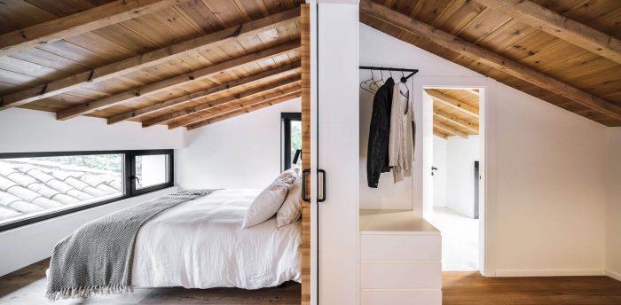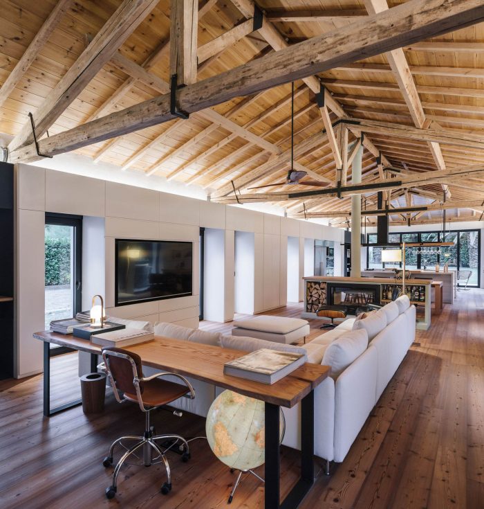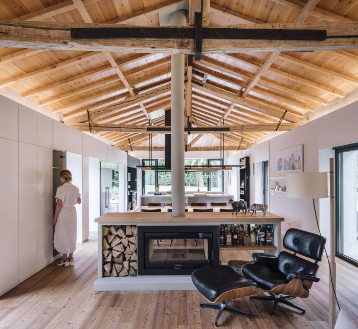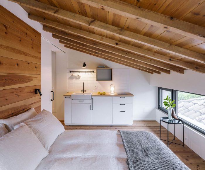In this volume, the program is divided into 3 well-differentiated zones: a large open and continuous space ordered through free-standing pieces and housing a living-dining room-kitchen. It is the heart of the dwelling, where the absolute protagonist is the large wooden roof, which is manifested in its entirety. Hidden behind a shelf, there is a bedroom with a bathroom and dressing room, and finally, on the first floor, an independent second bedroom with a bathroom, kitchen, and living room.