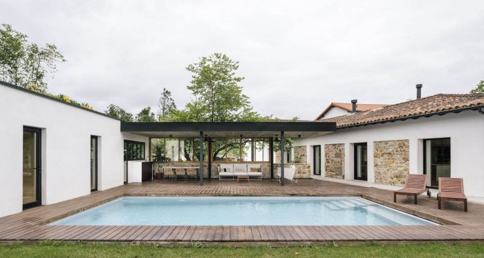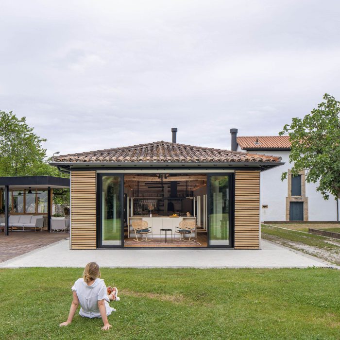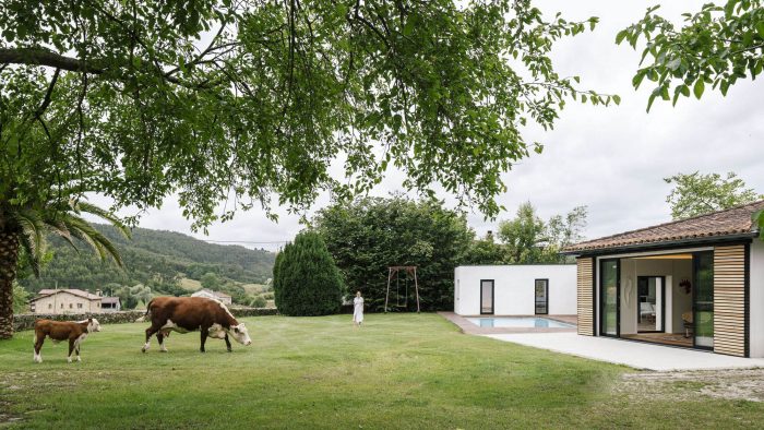 The newly built pavilion, with a more rational architecture, but preserving its simplicity and austerity, consists of a large covered porch and a series of rooms that complete the housing program: txoko, sauna, and guest room. The swimming pool is located in the resulting space between the two buildings, facing south and enjoying marvelous views of the Cantabrian mountains.