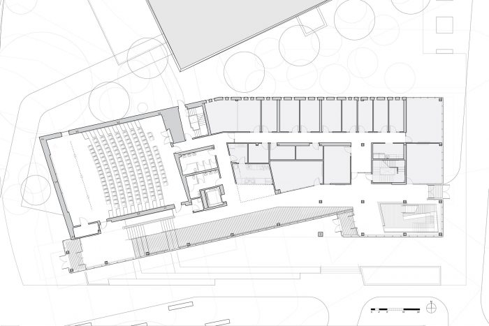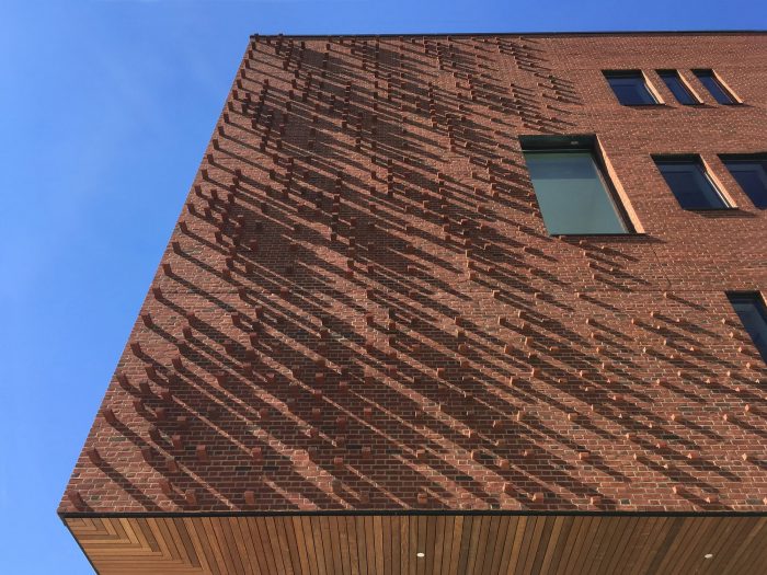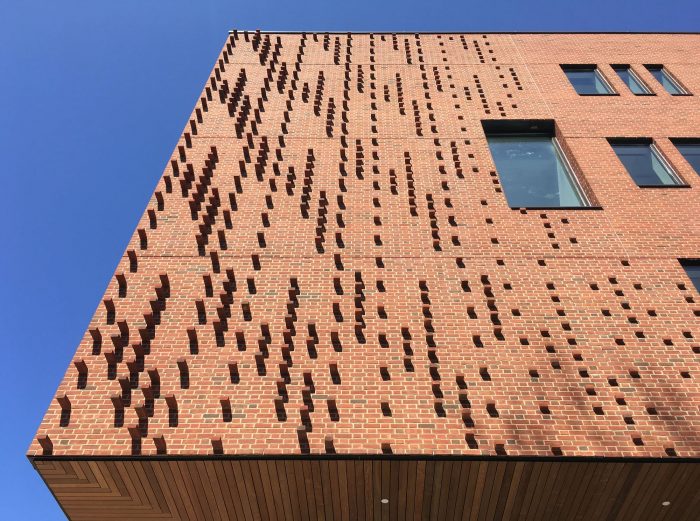 To meet the Data Sciences research mission, the design takes a different conceptual and constructive approach to brick. This project transforms the University’s standard red brick in a design that treats each brick as a digital “pixel” of information capable of expressing its status in relation to the building’s overall geometry in the campus context. The taught brick skin is subdivided into running and Flemish bond patterns with projecting header bricks in the Flemish bond zones designed using generative algorithms visualized in digital 3D modeling software. This creates “data streams” of textured brickwork which provide a reading of the massing’s inflections to the river and the campus. Shadows from the projecting bricks activate the facades creating dynamic, textural surfaces that communicate natural environmental data across the days and seasons—- information which is made legible at multiple scales across the building’s brick surfaces. Narrow and wide punched windows are inspired by the binary 0 / 1 that is fundamental to encoding data.