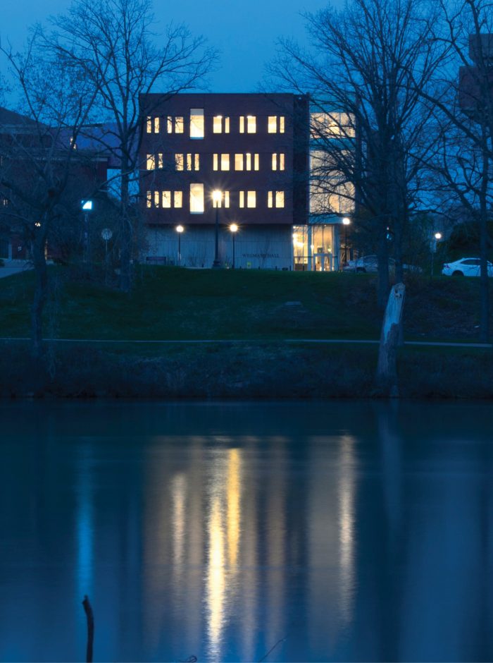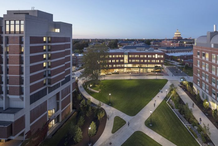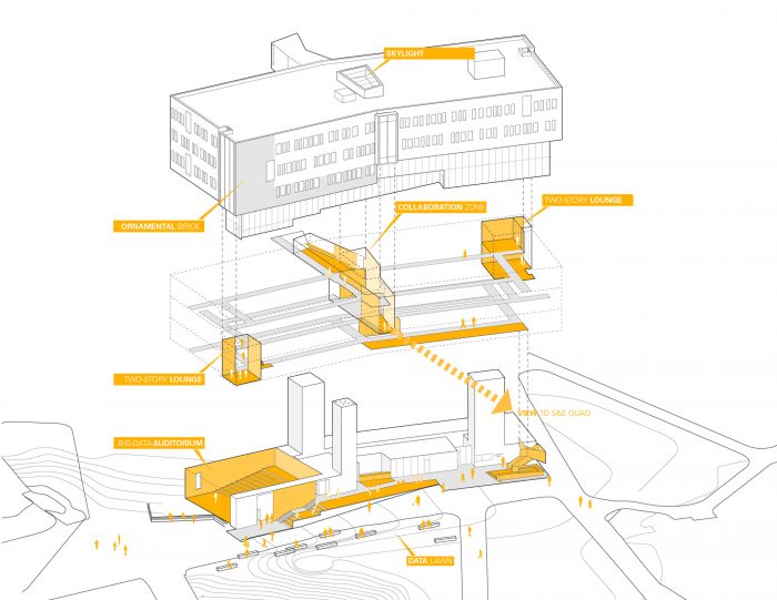 The massing of Institute of Data Science is created from a simple rectangular volume that is “broken” to unite two campus geometries: it offers a new public face to the Genesee River and completes the Science & Engineering Quadrangle transforming exterior vehicular roadways into a new 2-acre pedestrian and bicycle- oriented campus landscape.