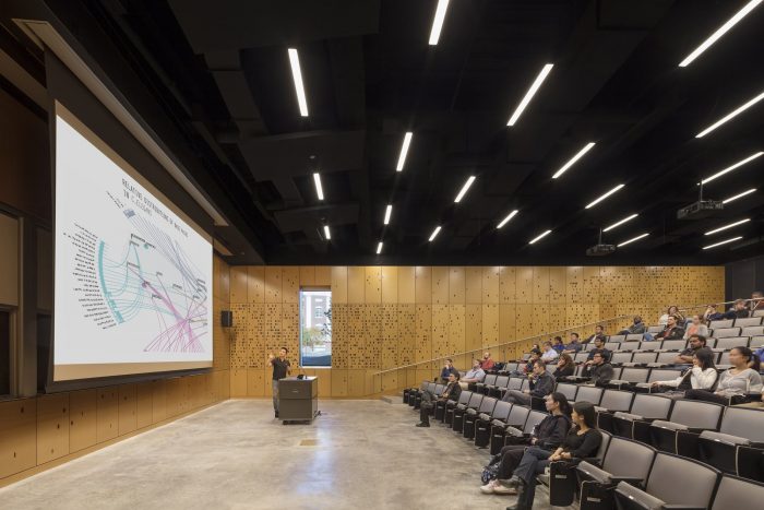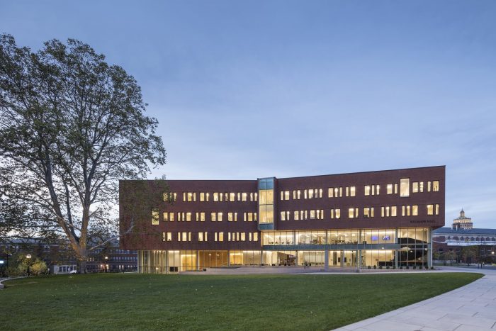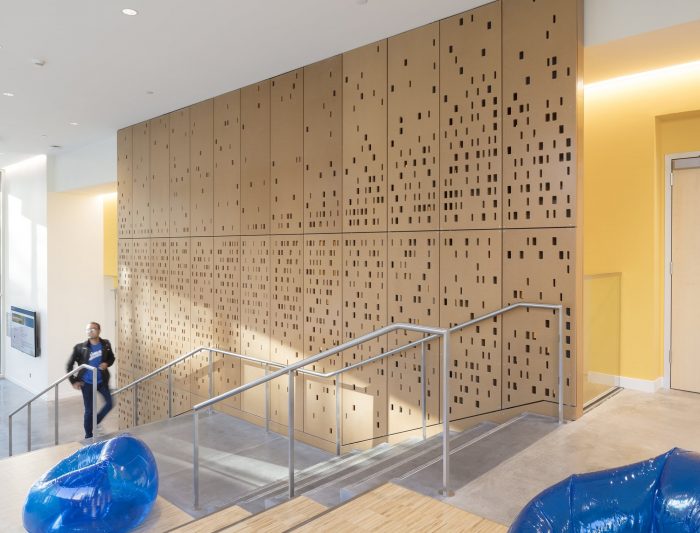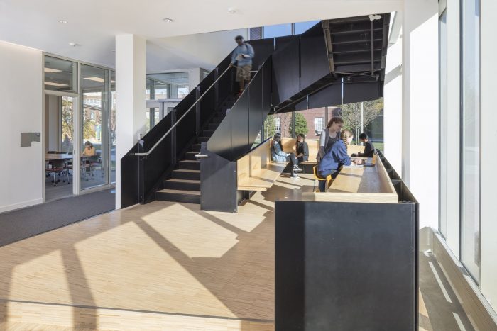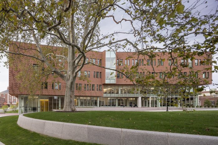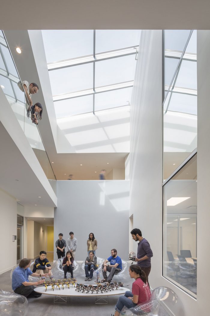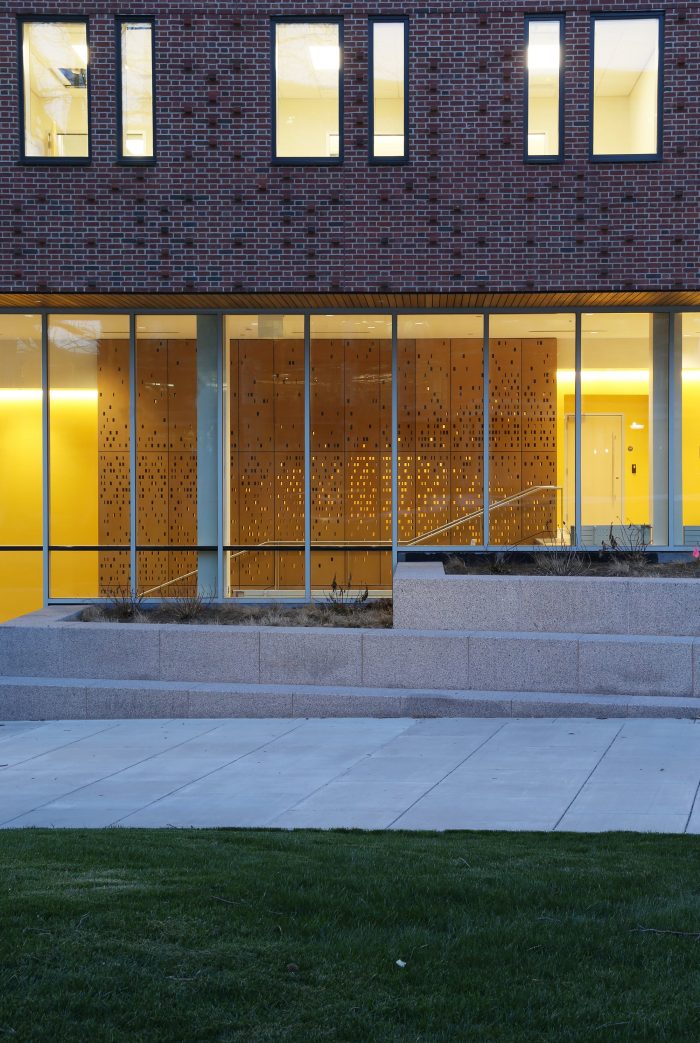 The public circulation sequence is expressed on the exterior facades, with large vertical glazed bays that “breakthrough” the brick envelope to reflect double-height collaboration zones and shared overlooks that admit natural light deep into the building interior. A double height curtain wall on the first and second levels interlocks with the figure of hung brick on the upper floors and expresses the Institute’s mission to create an open and collaborative research culture that engages the green space of the renewed Science & Engineering Quad.