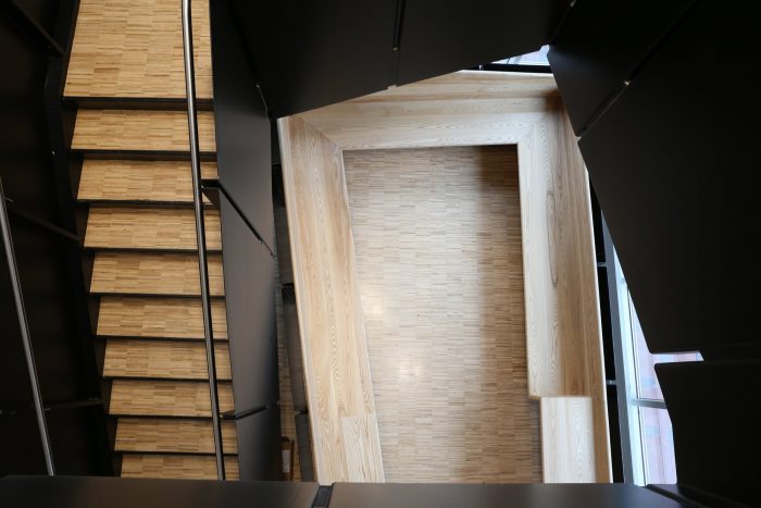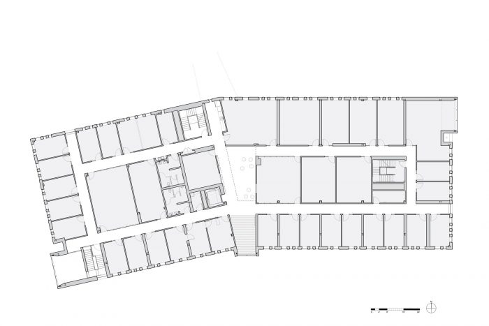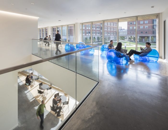 在室内,社会协作空间被整合到一个宽敞的公共流通序列中,该序列沿着建筑的周边,与每一层楼的双高协作区相连接,可以看到吉尼斯河和科学与工程四区。协作空间的序列在一个双层高度的共享实验室空间达到高潮,该空间有天窗,可以俯瞰四方区,并通过一座新的桥梁与邻近的霍普曼大厅相连。实验室空间被设计成与合作空间相邻,使用模块化海湾系统,支持灵活性和跨学科研究项目。所有的内部实验室走廊都以窗户为终点,将自然光引入建筑内部深处。