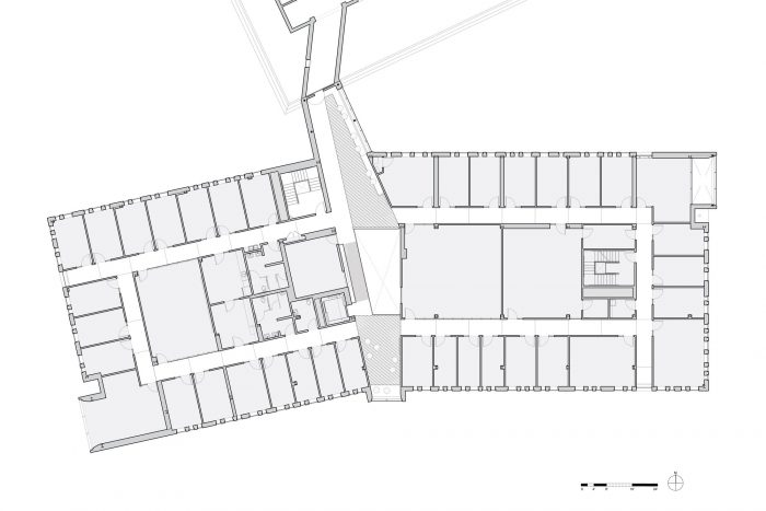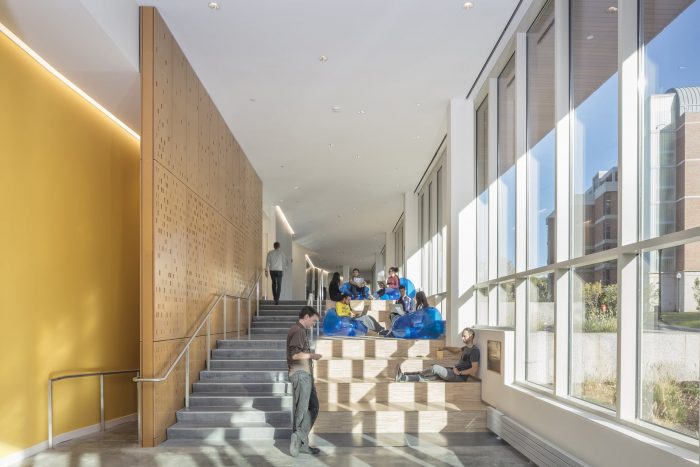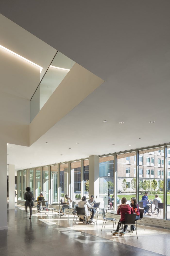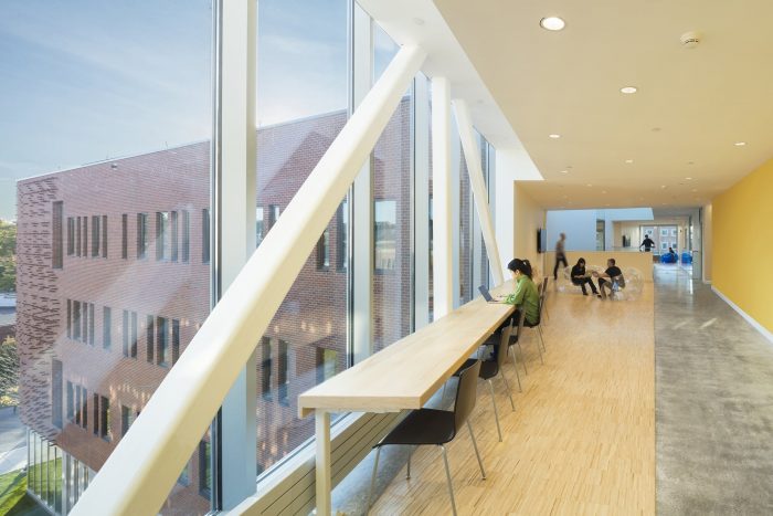 In the interior, social collaboration spaces are integrated into a generous public circulation sequence, which follows the building perimeter and engages each floor level with double-height collaboration zones with views to the Genesee River and the Science & Engineering Quad. The sequence of collaboration space culminates at a double-height shared lab space with skylights that overlook the Quad and is linked by a new bridge to neighboring Hopeman Hall. Lab spaces are designed adjacent to collaboration spaces, using a modular bay system which supports flexibility and interdisciplinary research projects. All interior lab corridors terminate with window overlooks which 6 admit natural light deep into the building interior.