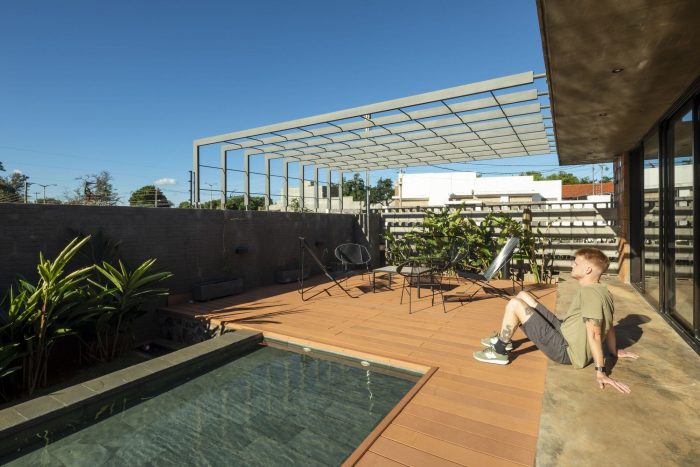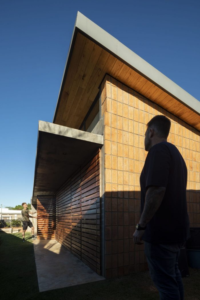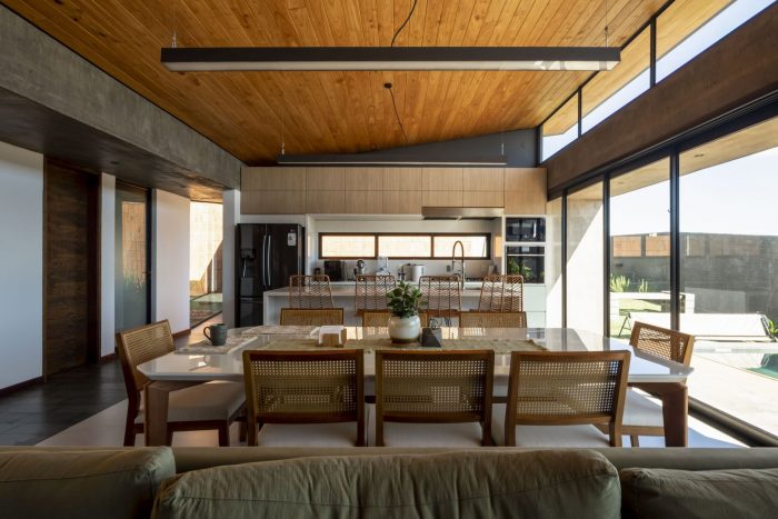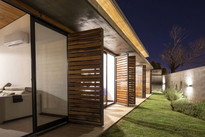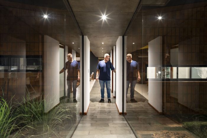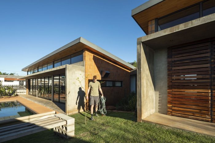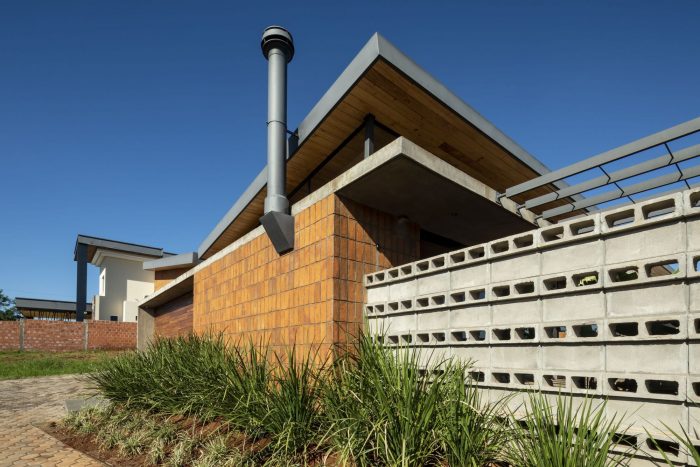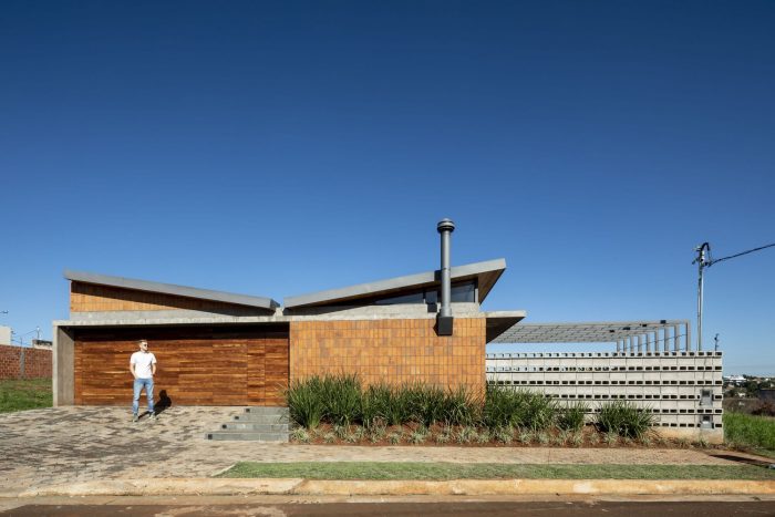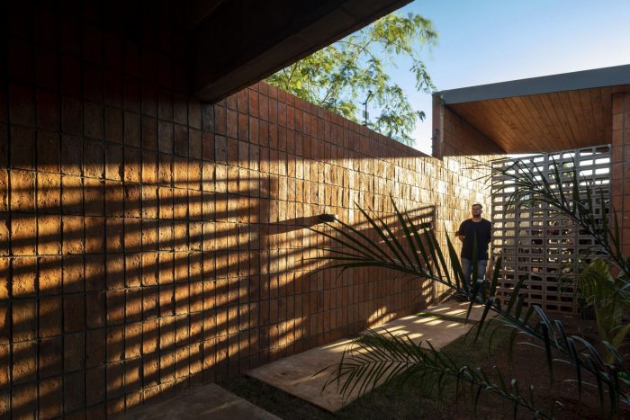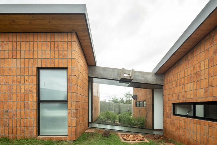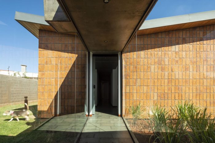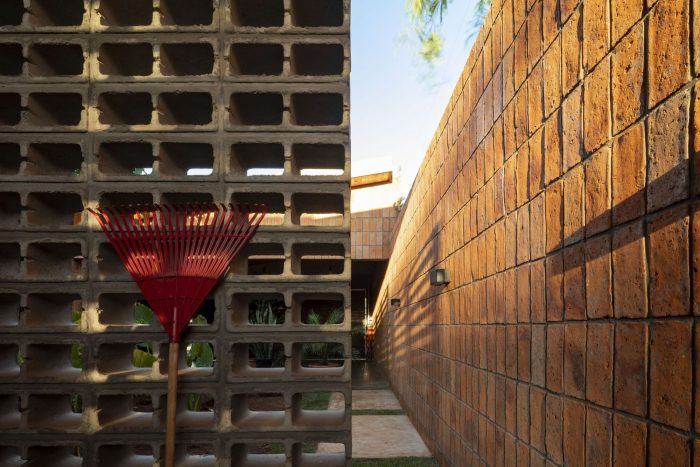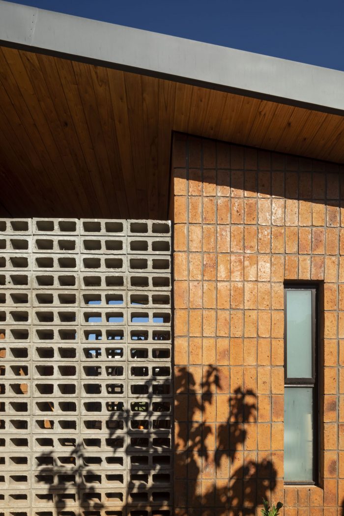 The container walls of the house consist of ordinary rope brick masonry, an expanded polystyrene core and a lining of the same brick, providing greater thermal inertia inside and reducing maintenance outside. The galleries are part of a visible concrete structure that links the entire house and incorporates the gutter. Wood is used as an enclosure in the main entrances and as an element to regulate light entry into the bedrooms.