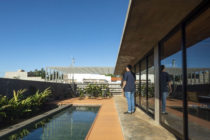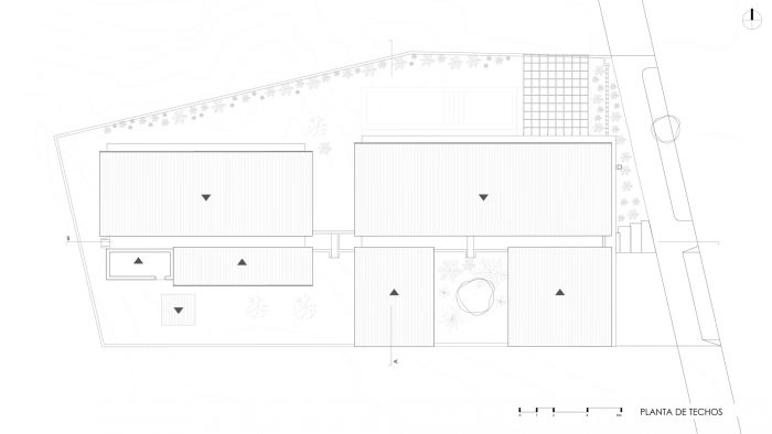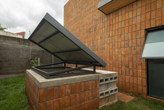 The metal covers are inverted towards the center of the house allowing the entry of natural lighting from above. The concrete gutter receives rainwater and distributes it to different registers, accumulating it in a lower reservoir that allows it to be reused in maintenance and cleaning activities.
