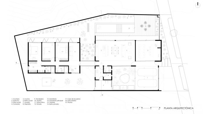 该地块的尺寸优于传统的尺寸,允许在一个层面上思考房屋的发展,将不同的空间与院子联系起来,并允许超越视觉的互动,将内部与外部完全融合。