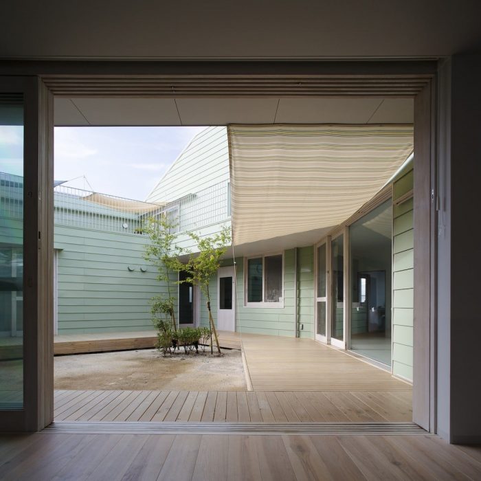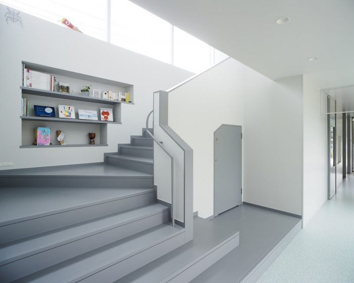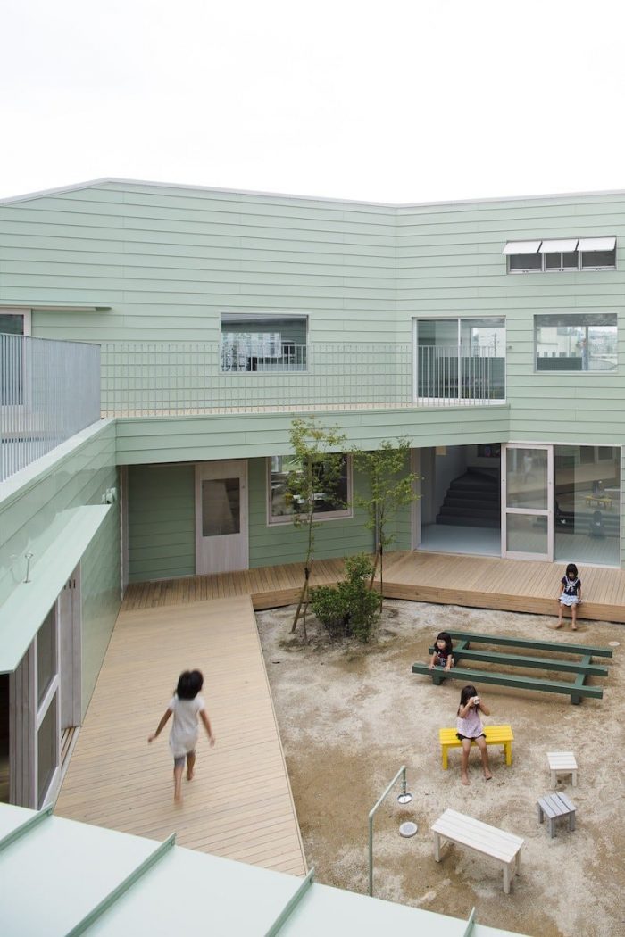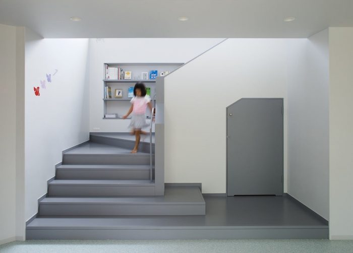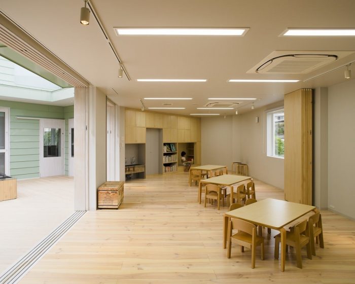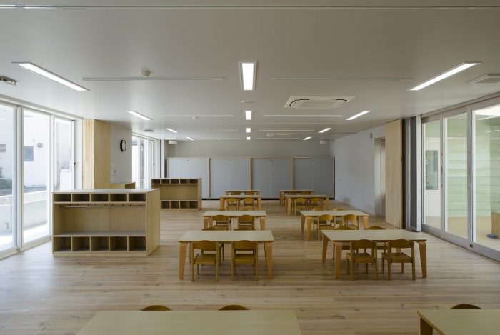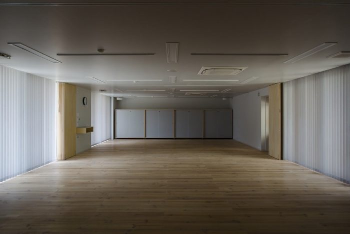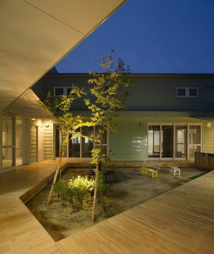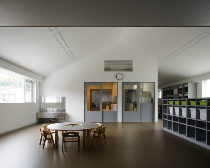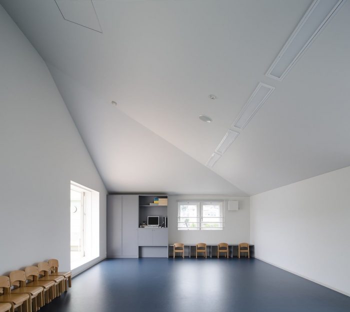 This project was planned with the request of a nursery school to be “not a small school, but a big house.” We were asked to design a space, which can embrace kid’s daily activities, such as eating, sleeping and playing, rather than designing a special space as a nursery school. We decided a building to divide the open space into a courtyard and a small playground rather than having one big playground. This reduced scale allowed kids to feel the building like ‘home’, and it also helped expanding the varieties of kid’s activities in the continuous area of playground, nursery room and courtyard.