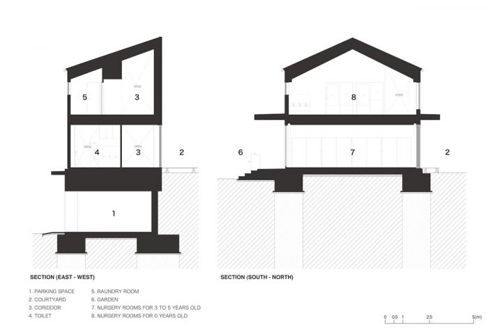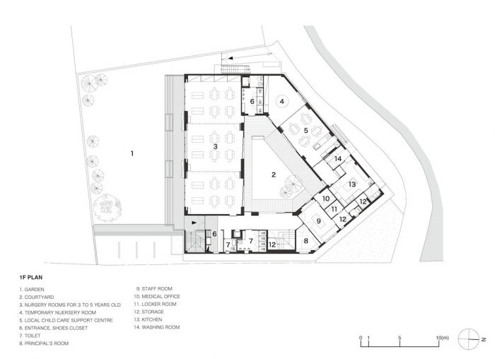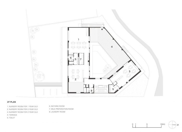 这个项目是根据一个幼儿园的要求规划的,"不是一个小学校,而是一个大房子"。 我们被要求设计一个空间,它可以容纳孩子的日常活动,如吃饭、睡觉和玩耍,而不是设计一个特殊的空间作为幼儿园。我们决定将一个建筑的开放空间分为一个庭院和一个小操场,而不是有一个大操场。这种缩小的规模让孩子们感觉到建筑就像 "家 "一样,也有助于扩大孩子们在操场、育婴室和院子的连续区域内的活动种类。