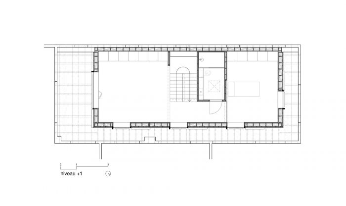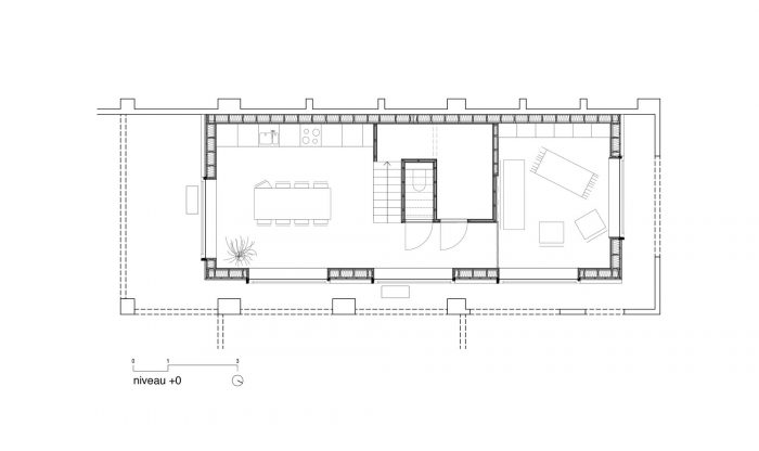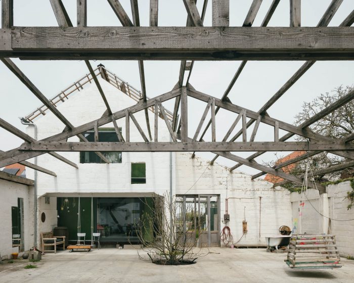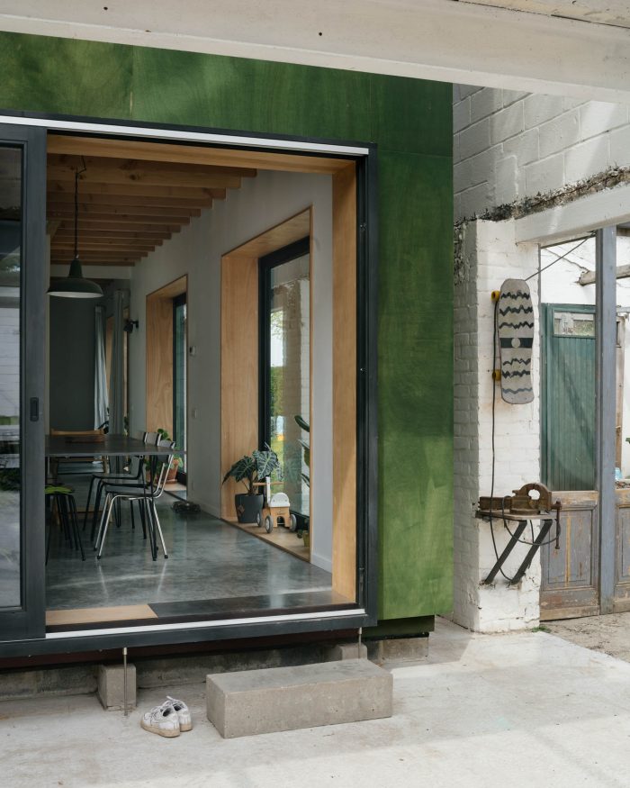 一个最小的平面图,可以通过棚子的外部空间的覆盖来扩展。这个合理的计划和现有的细木工制品之间产生了激烈的对话。