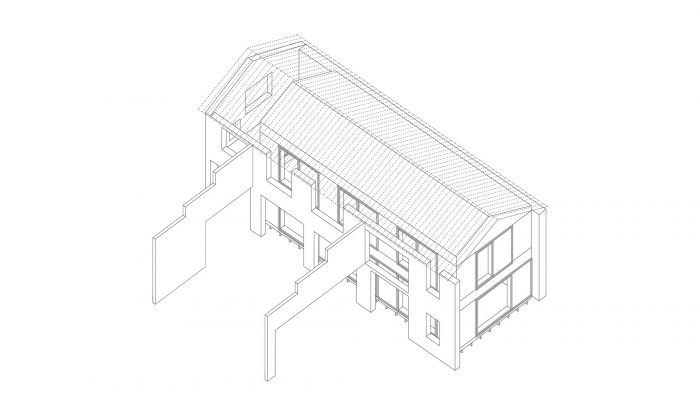 The roof of the shed is opened up, the spacious volume serves as an intimate walled garden. The adjacent volume is stripped of all inner walls and floors and a new wooden house is built on top of the existing slab.