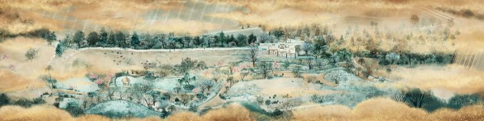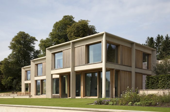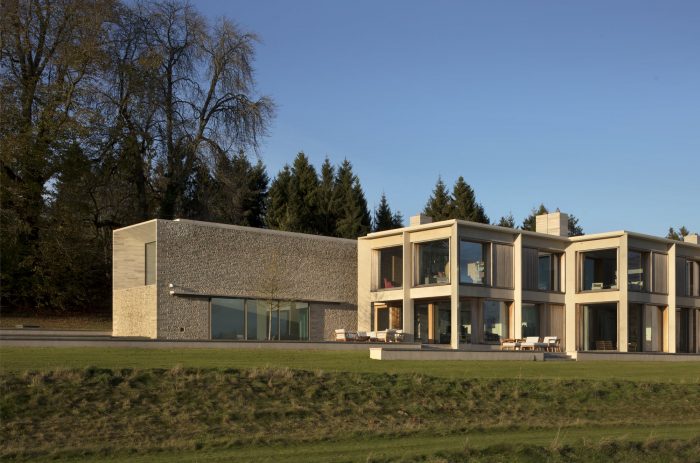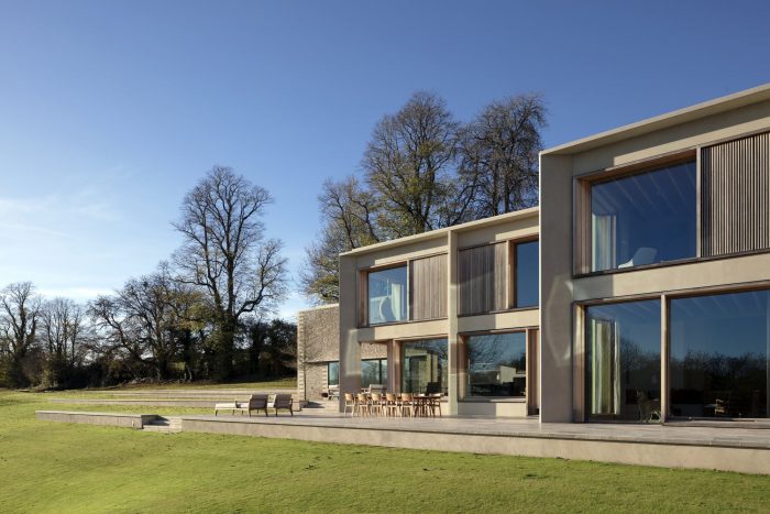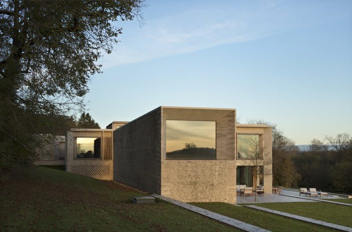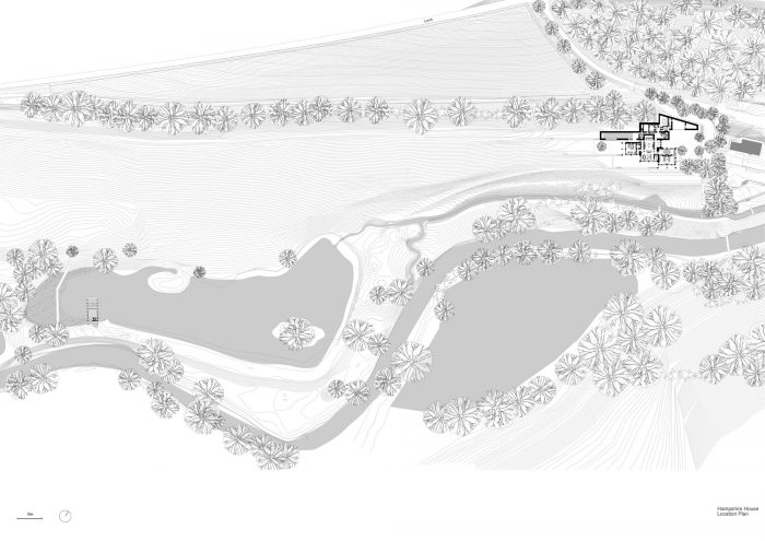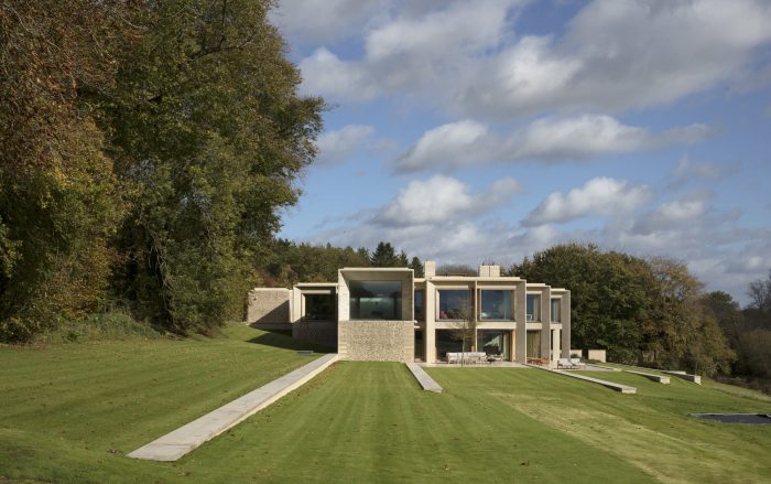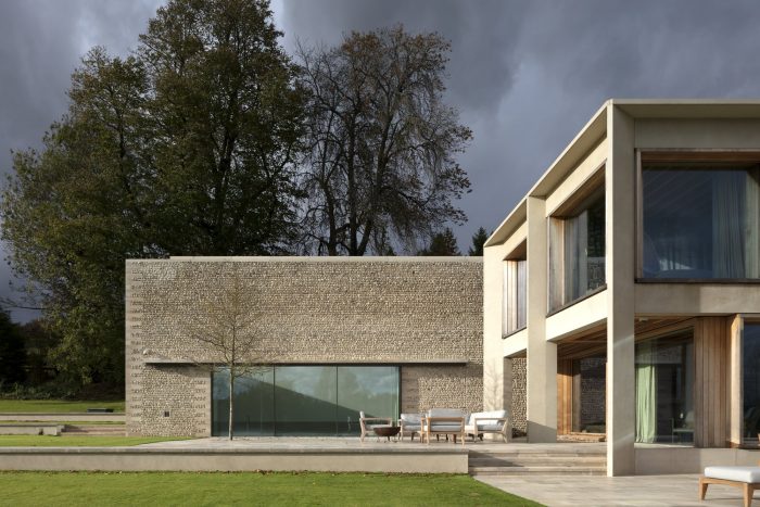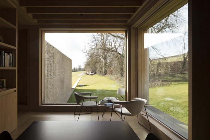 The property is approached from the north, down a steep bank. The house is nestled into the hillside and appears as a single story flint building echoing the demesne walls common in the local area. Visitors are guided down a tree-lined road to a lower entrance courtyard where the building rises to two stories. The house is arranged in a series of staggered volumes, which are conceived of as an entrance to the landscape. The spaces frame the three key views; the meadows, the lakes, and the gardens. In the center is the top-lit, double height kitchen, around which the daily life of the family revolves.