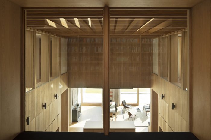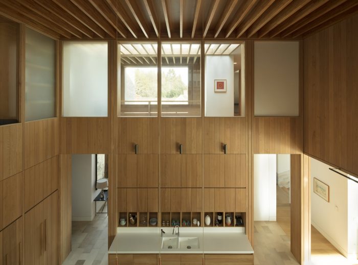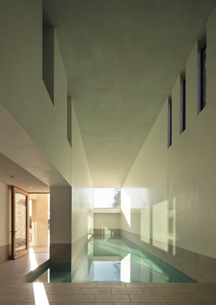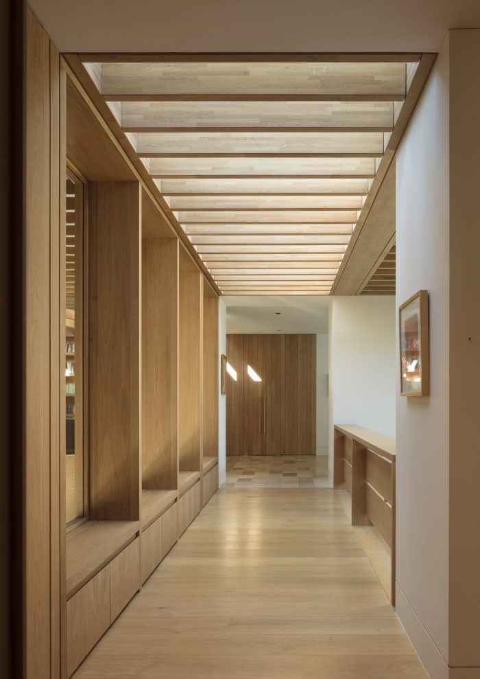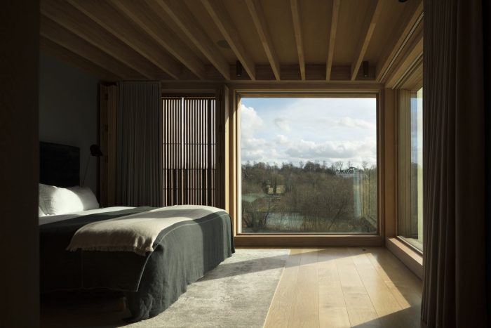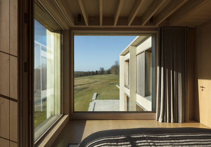The main staircase is lined in Purbeck stone with cantilevered precast concrete treads. The upstairs circulation spaces overlook the kitchen and pool below and also open out to accommodate the library, reading room, and play space, which are articulated by lanterns to allow clerestory light into the space. The oak-lined bedrooms enjoy panoramic views across the site and include full height shutters with external louvers allowing the space to be fully opened up to the landscape and also providing natural ventilation.
