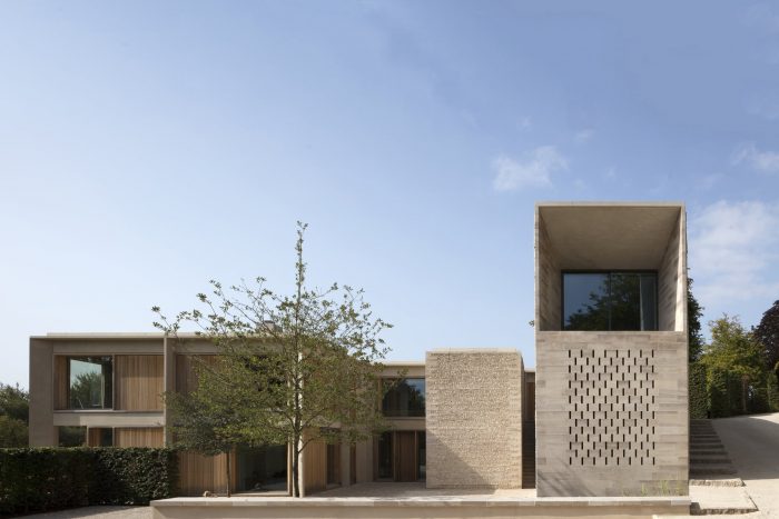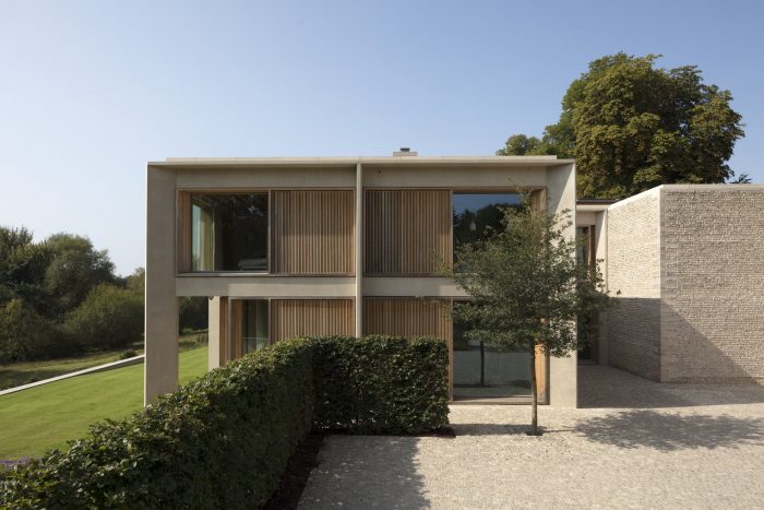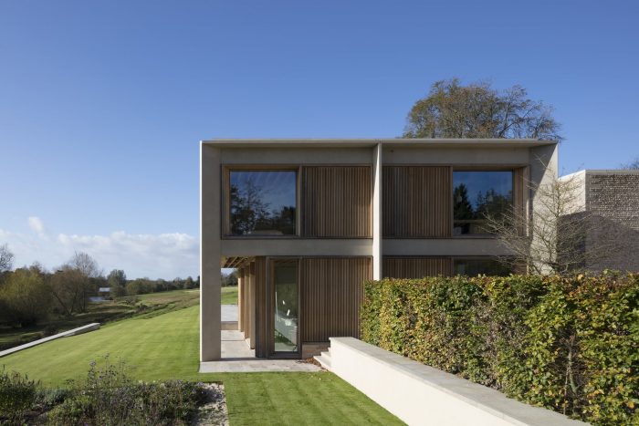 The materials have been chosen to relate to the surrounding context and include coursed flint, Purbeck stone, and precast concrete. Timber windows and cladding are made from oak which is untreated and will gradually weather to a silver-grey to match the color of the stone and flint. The structure is a combination of steel and concrete frame with visual oak joists providing support to the upper floor and roof slab. The house includes ground source heating technology, PV panels and high levels of thermal insulation.