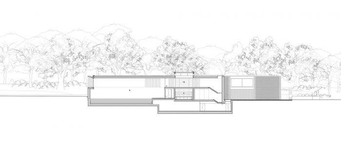 该房产从北面沿着陡峭的河岸走来。这座房子依偎在山坡上,看起来是一座单层的燧石建筑,与当地常见的庄园墙相呼应。参观者沿着一条绿树成荫的道路来到一个较低的入口庭院,那里的建筑上升到两层。房子被安排在一系列交错的体量中,被设想为景观的入口。这些空间框住了三个主要的景观:草地、湖泊和花园。中央是顶部采光的双高厨房,家庭的日常生活围绕着它进行。