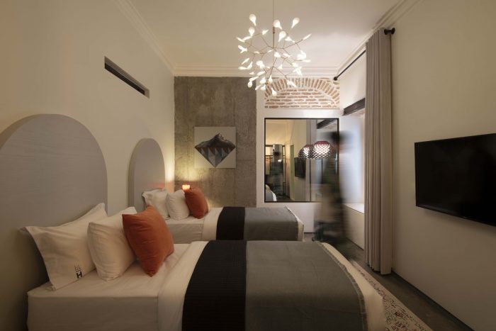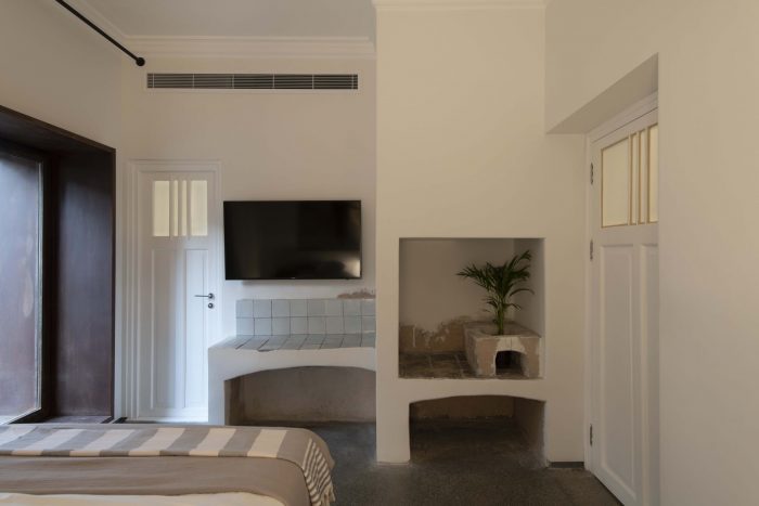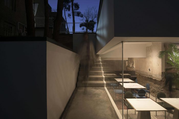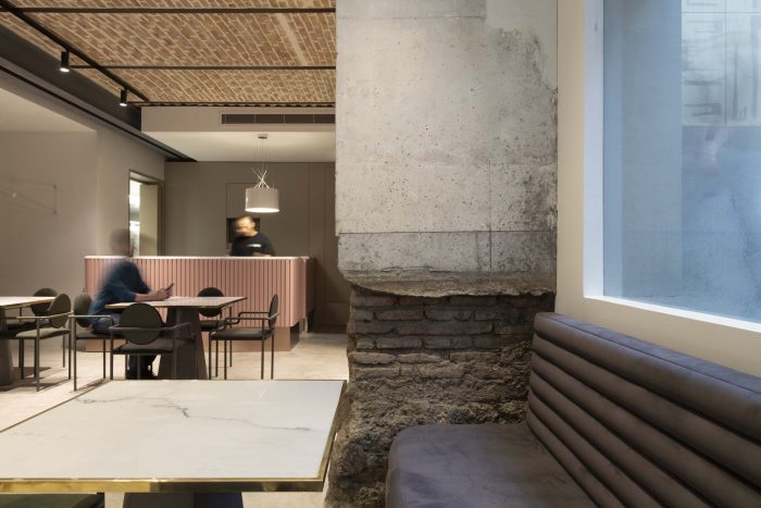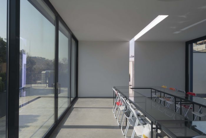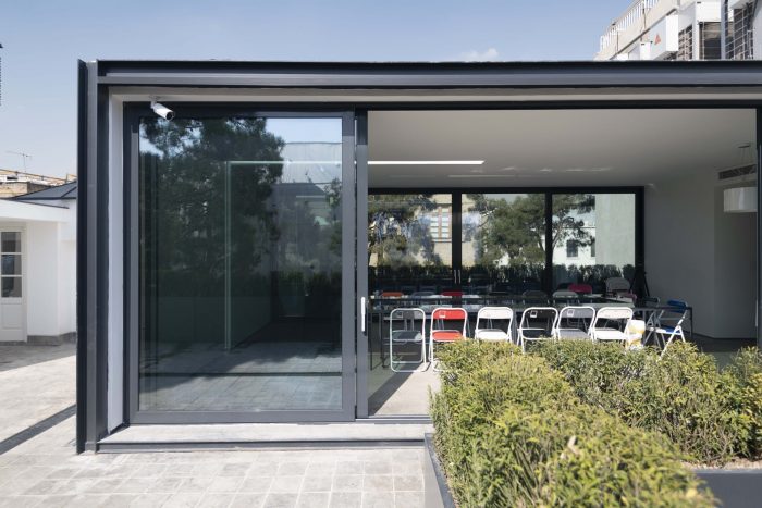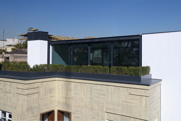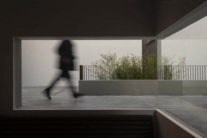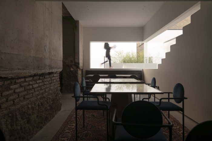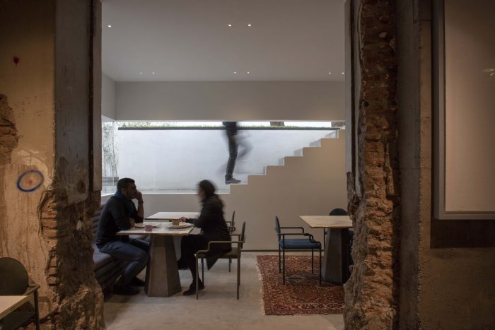 The new volumes create the project’s garden, recessed courtyard, part of the restaurant, and gallery. These new layers also seep inside the original building, bringing new functions inside, while maintaining its original layers and structure. An added neutral volume on the east elevation is used to house the hotel bathrooms, and rises to the roof to create the hotel’s multi-purpose space. This space provides a panoramic view of the surrounding areas, while remaining hidden from street level. In the extensions construction metal frames were added to reduce the boundary between inside and outside. These frames define the gallery entrance, and make the border between the gallery and Lolagar Alley transparent. These frames are also used on the building’s façade to provide more light and views to the hotel guests.