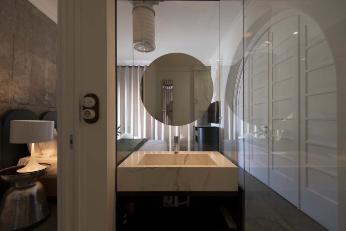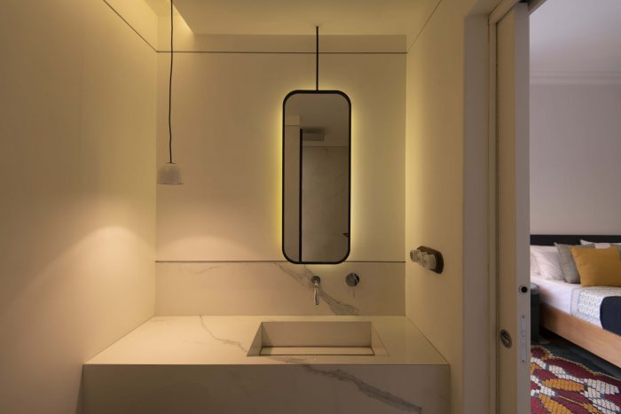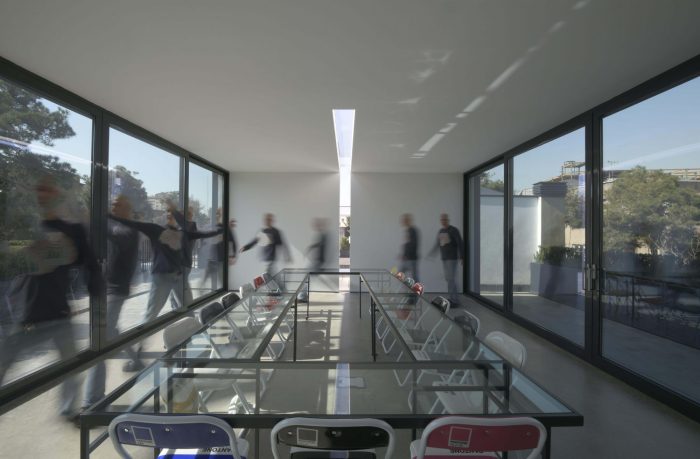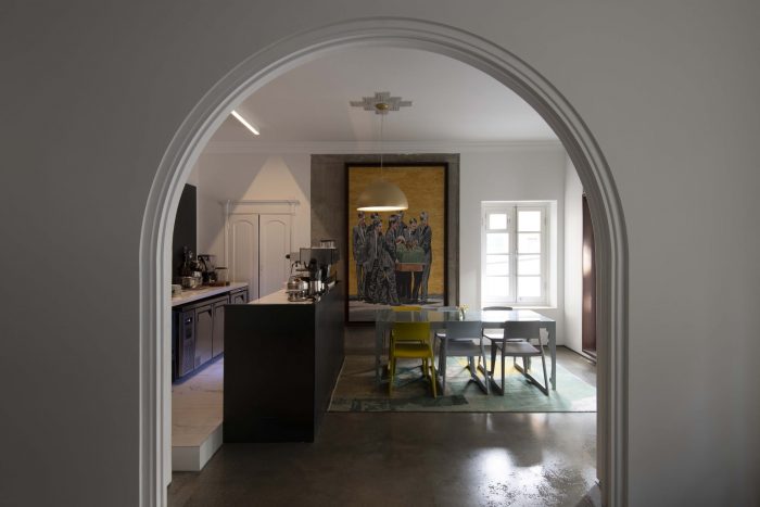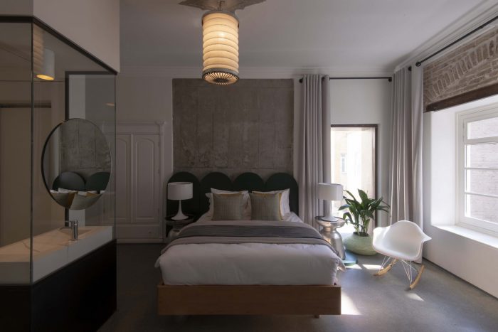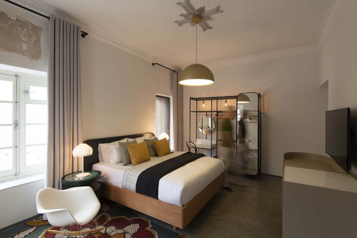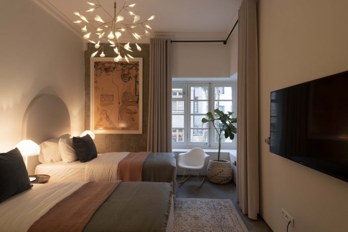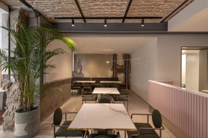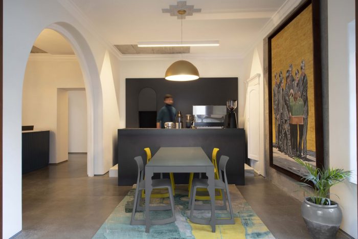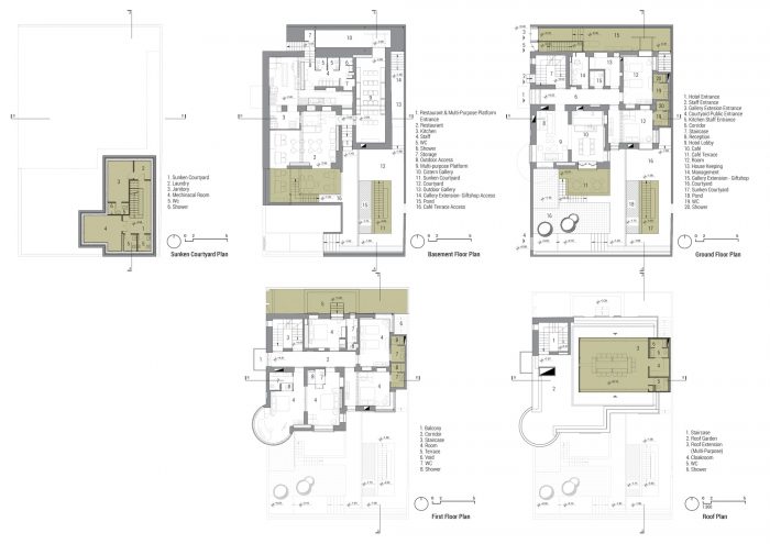 The new volumes create the project’s garden, recessed courtyard, part of the restaurant, and gallery. These new layers also seep inside the original building, bringing new functions inside, while maintaining its original layers and structure. An added neutral volume on the east elevation is used to house the hotel bathrooms, and rises to the roof to create the hotel’s multi-purpose space. This space provides a panoramic view of the surrounding areas, while remaining hidden from street level. In the extensions construction metal frames were added to reduce the boundary between inside and outside. These frames define the gallery entrance, and make the border between the gallery and Lolagar Alley transparent. These frames are also used on the building’s façade to provide more light and views to the hotel guests.