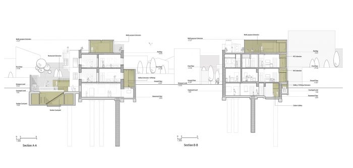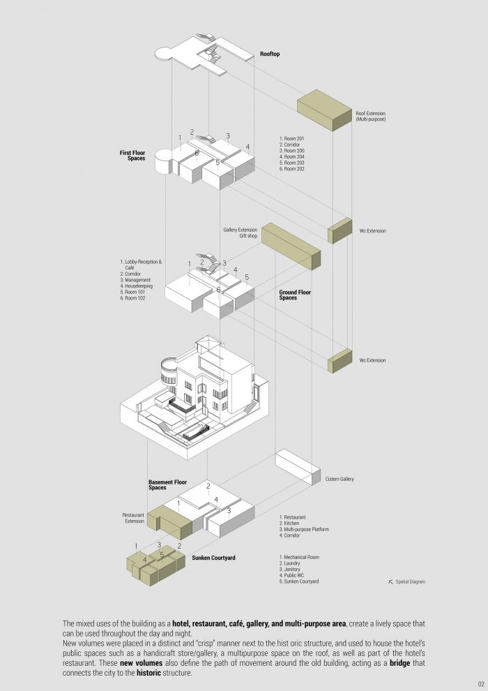 With their simple forms and muted colors, these new volumes accommodate some of the building’s new functions, while also putting the user in contact with the building at different heights and from different perspectives. The new pathway they create gives variety of circulation paths around the building. These new layers are constructed using contemporary material, and while they contrast the building’s original material, they attempt to remain subtle and less seen. The juxtaposition of new and old layers presents its occupants with the building’s history as well as efforts for its restoration.