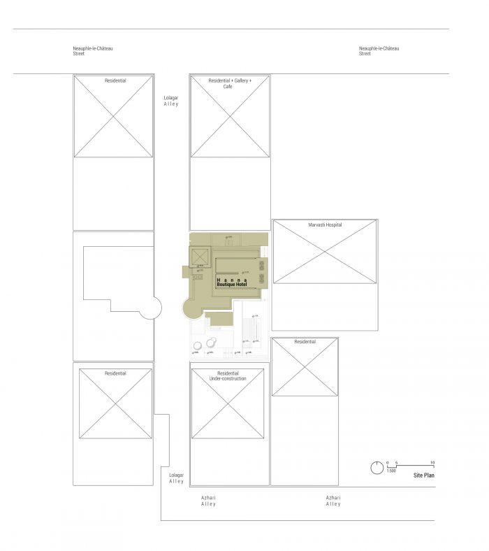 Around 90-years ago, six buildings were constructed in the center of Tehran, creating its one and only symmetrical street. These remaining structures on Lolagar Alley are some of the best examples of architecture from the First Pahlavi era, a time when modern architecture was beginning to appear in Tehran. Initially all six of these buildings were residential, but over time, like many other buildings in downtown Tehran, they were left unoccupied. Hanna Project, which includes a hotel, restaurant, gallery, and multipurpose spaces, was designed in one of these buildings, with the intention of bringing life back to Lolagar Alley and Tehran’s city center.