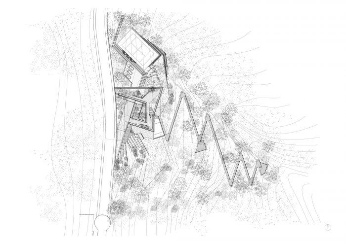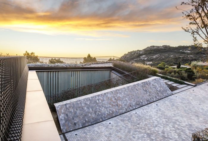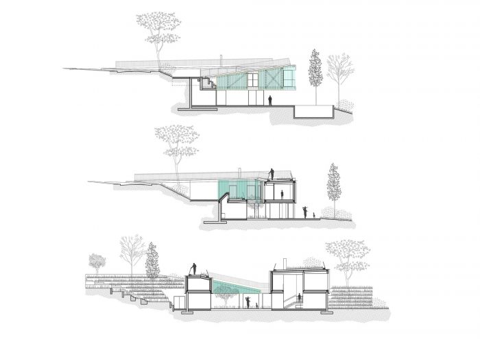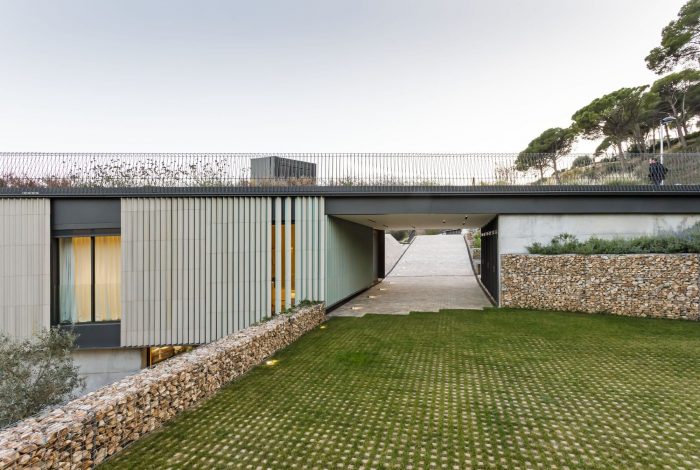The building does not exceed in height the street level and merges its volume with the landscape. A rooftop garden welcomes and serves as a panoramic promenade that gently guides down to the house’s entrance while embracing a patio in its core.