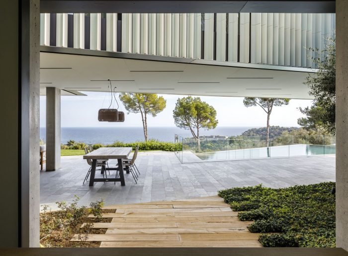 On the one hand, the ground floor accommodates the daytime program, and it is partially underground, combining the massiveness and the tectonics of a system of concrete walls and pillars with the transparency of the great, light, and glazed carpentry. This is how the building frames the picturesque views over the cove, as well as pursues the continuity with the terrain, the landscape, and the terrace, which is covered by the flight of the upper floor. While its encounter with the terrain tempers the house due to the effect of the thermal mass, the cantilever over the terrace prevents the glass from the direct incidence of the sunlight, so as to offer comfort and efficiency to the interior climate. The program spins around a central patio, which allows the sun to enter after midday and triggers the natural ventilation of the house as a result of the chimney effect.