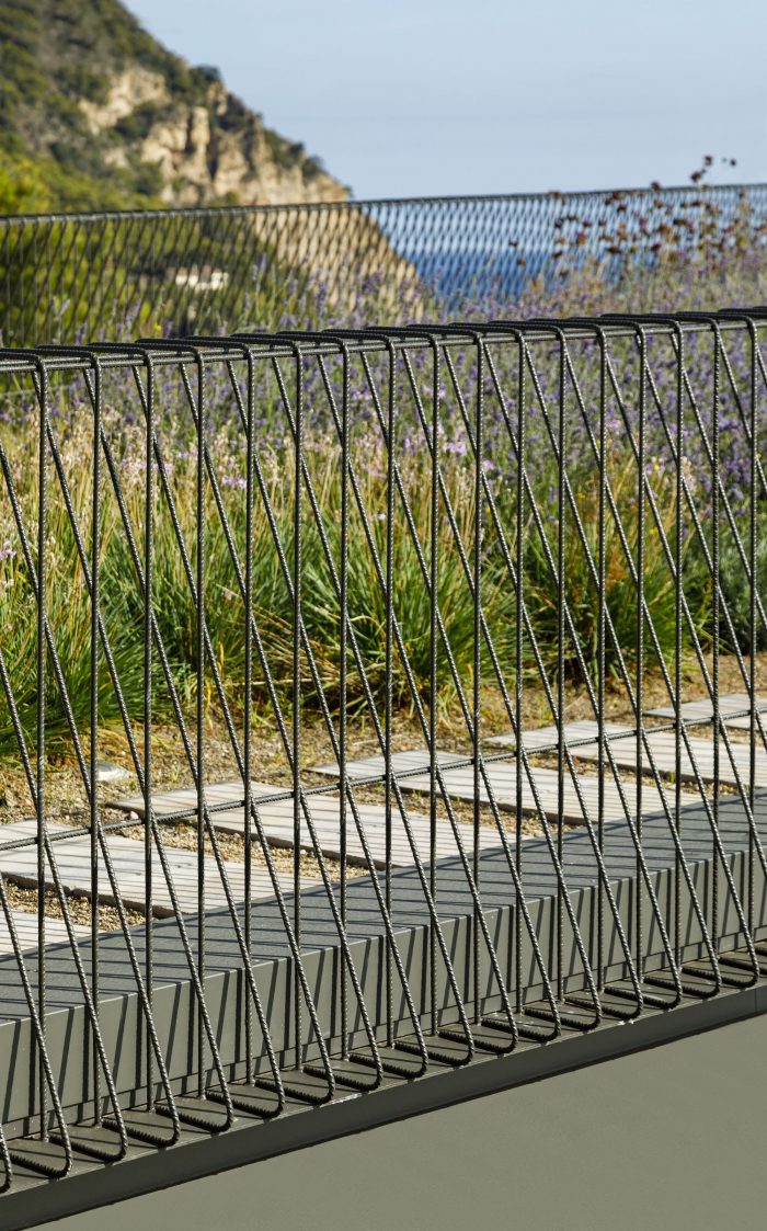 On the other hand, a light steel structure rests on the ground floor’s massive concrete structure. A system of bridge-like steel trusses flies over the terrace and raises the first floor, which accommodates the night program. While the lower floor blurs the boundary between the inside and the outside, the upper floor requires of intimacy, and therefore it has been clad with a permeable ceramic skin. A piece designed along with Ceràmica Cumella is unfolded as the last layer of the ventilated façade at different rhythms, which allows the interior chamber to ventilate while it varies the gradient of light and views that reach the rooms. The dual character of these components allows the perception of either the matt and natural color of the ceramic or a soft turquoise color of its glaze, according to the direction in which one may look at the building. That is, either the natural color of the earth or the color of the sea, the sky, and the surrounding environment. On top of it, a green roof isolates and tempers its interior in a kind and natural manner.