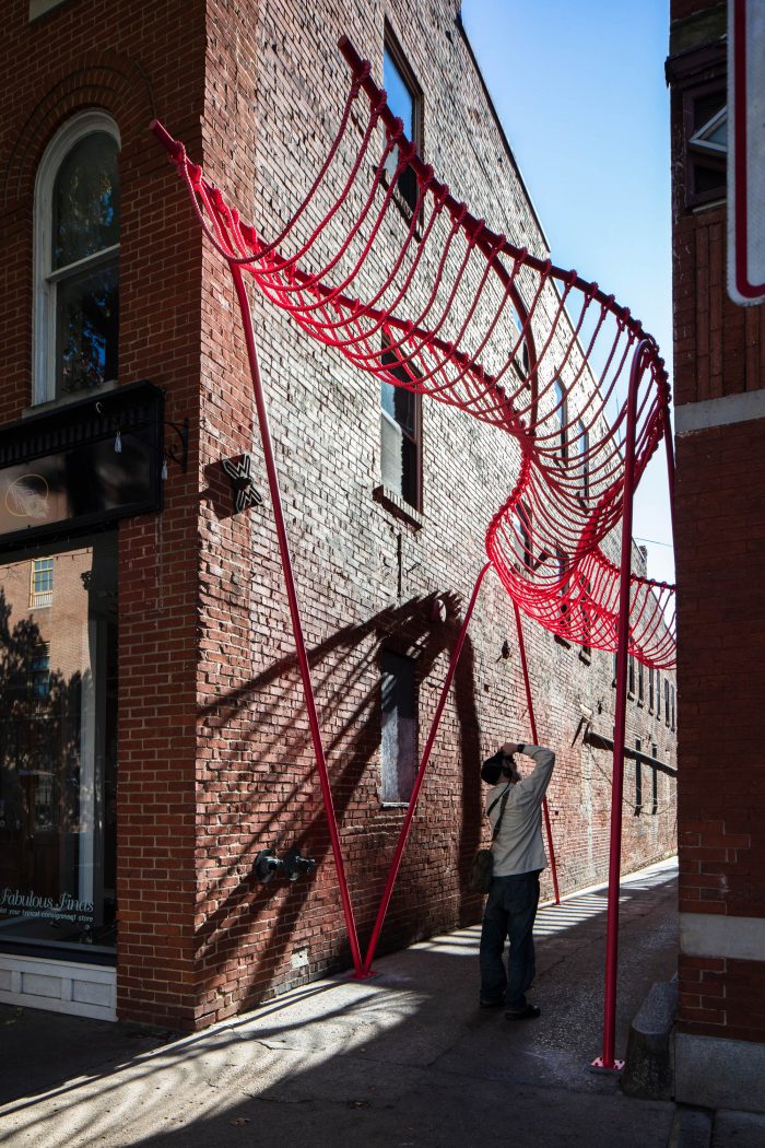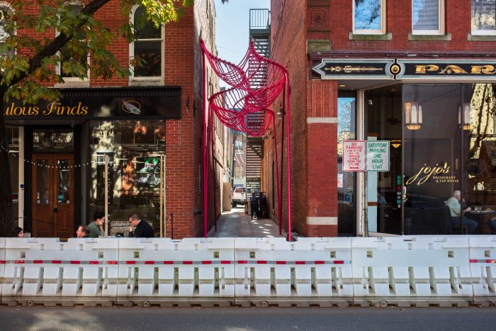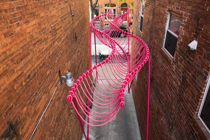 The Downtown Frederick Partnership in cooperation with the Potomac Valley Architecture Foundation, AIA Potomac Valley and the Frederick Arts Council sponsored a design competition in November of 2019 for spatial installations in specific alleys that would better link the downtown urban fabric. SomePeople’s proposal called “Happy Stripe” was one of the three selected projects for implementation. The installation will be in place through November 2021 encouraging locals and visitors to safely visit Downtown Frederick.