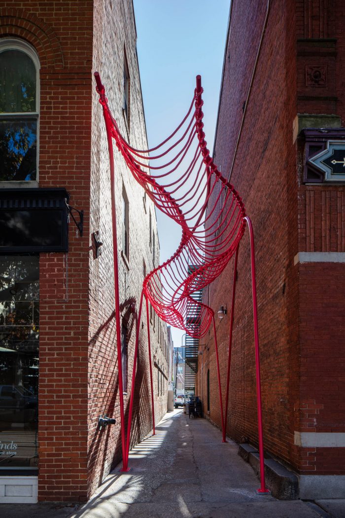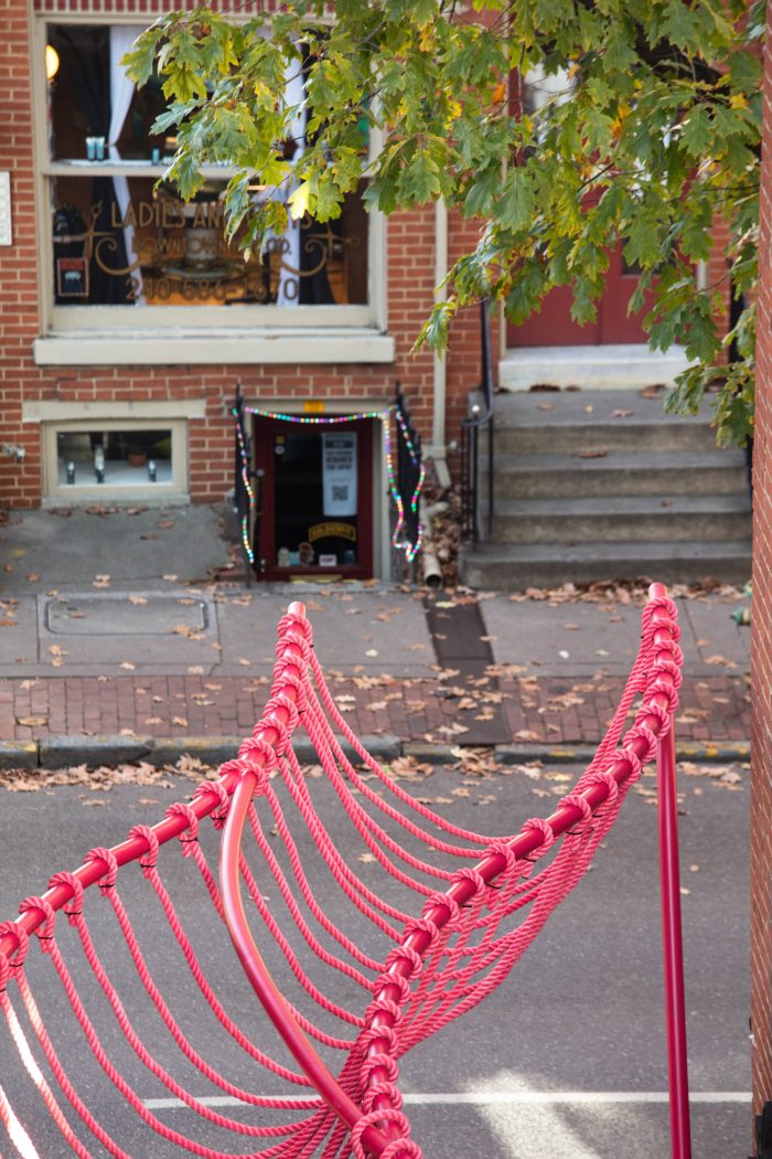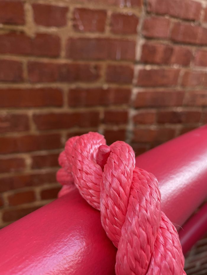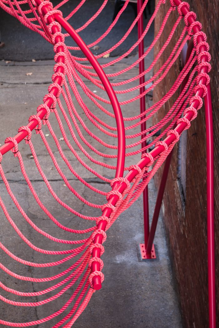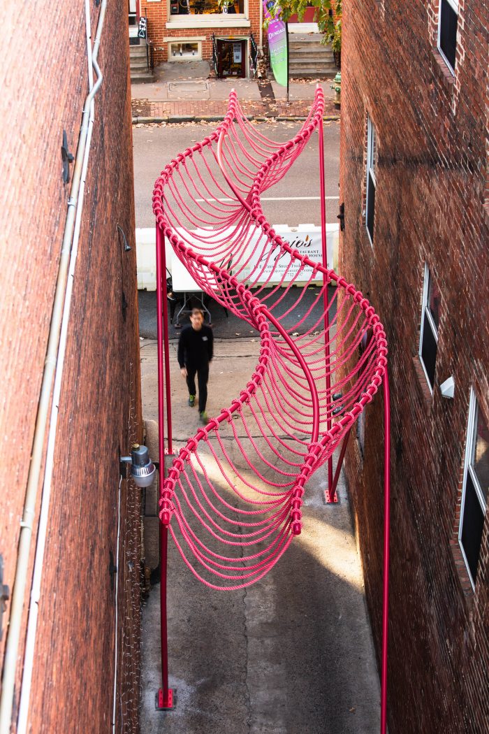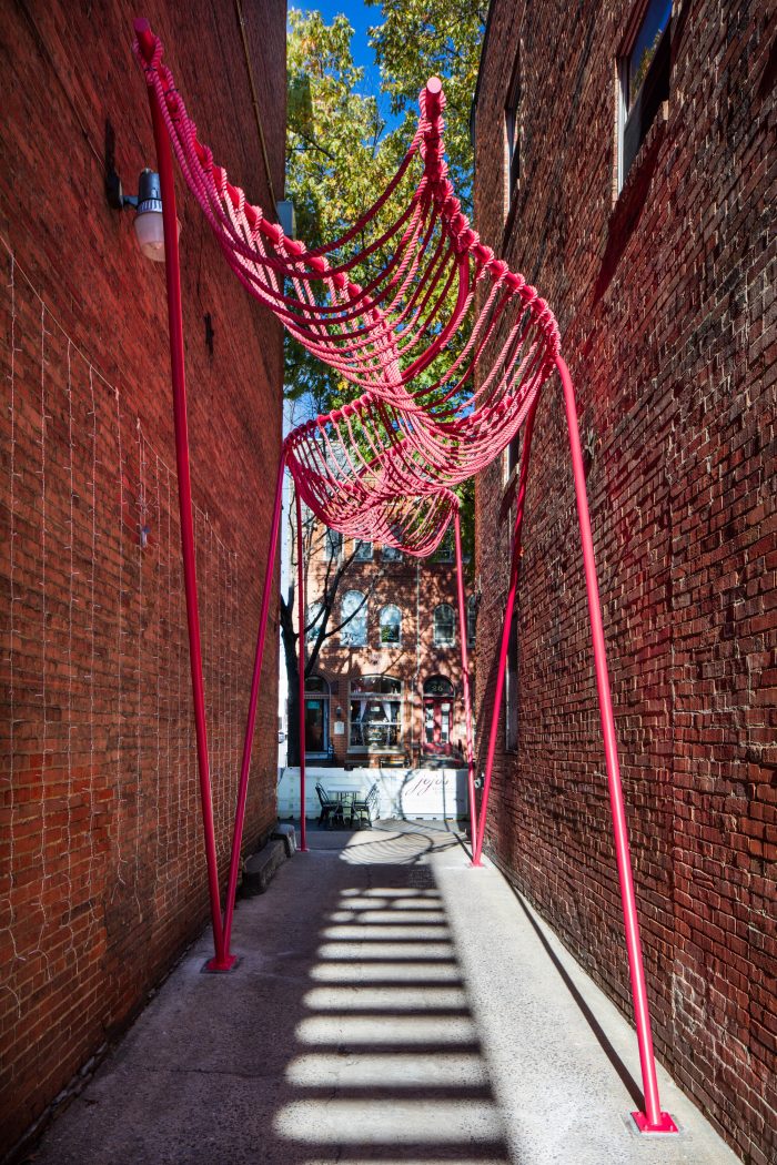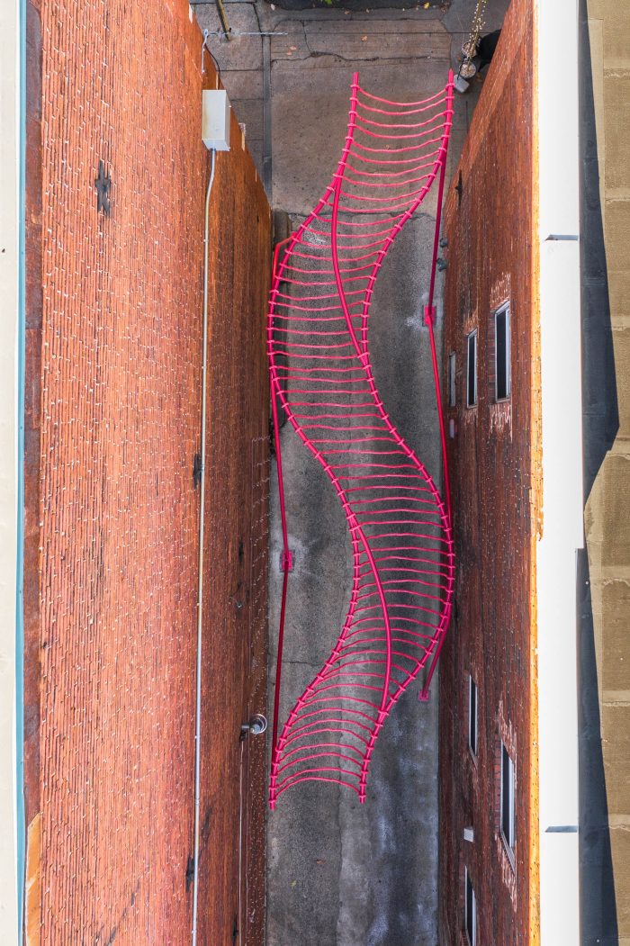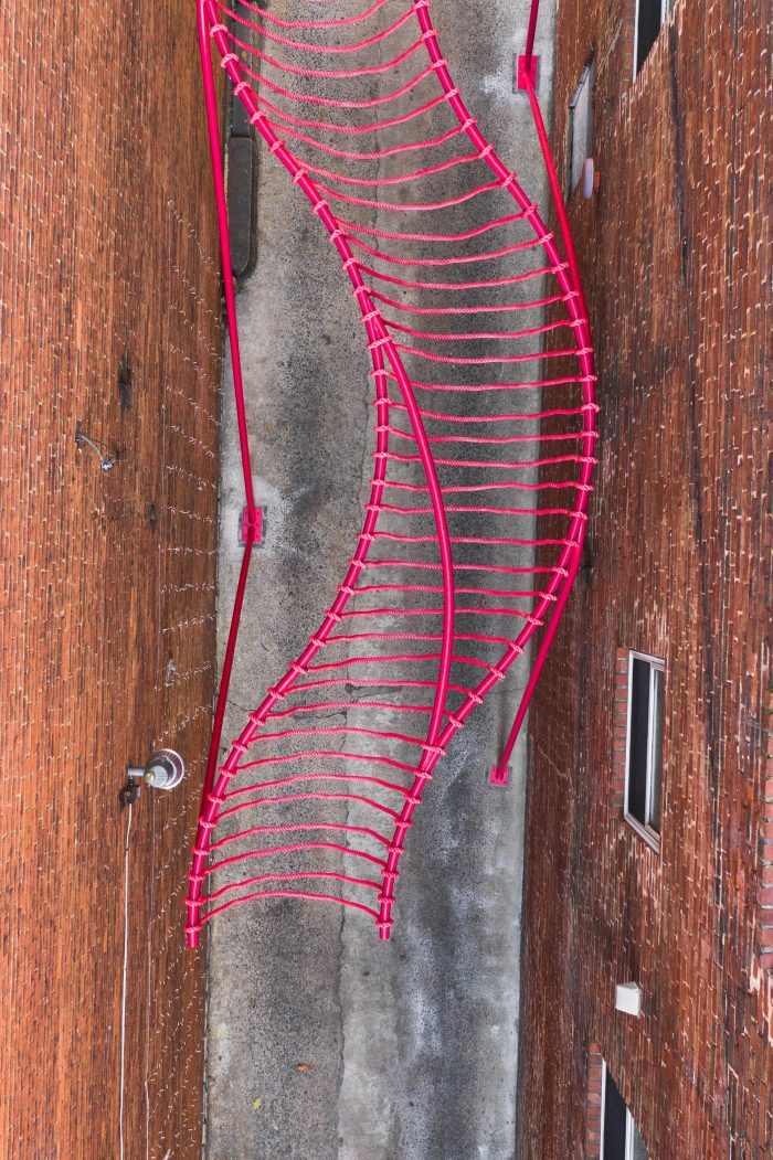 around it. The red-brown brick color becomes a brighter, more vibrant pink color as the stripe enters the alley. The hanging ropes bring porosity to the structure and create playful shadows which change throughout the day.