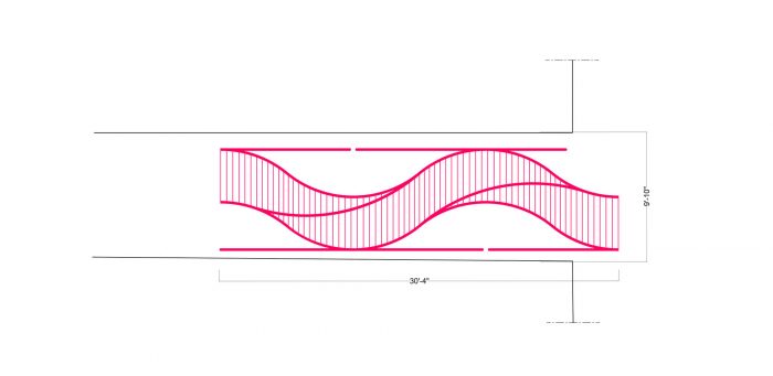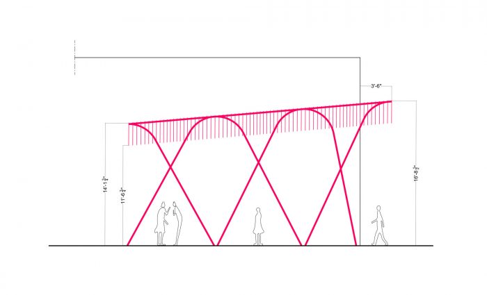 Happy Stripe is a playful linear structure made of a bent steel frame and hanging nylon ropes. It acts as a vibrant stripe that highlights the urban and architectural characteristics of the specific lot while creating a dialogue with the existing context. The spline geometry of the frame is a reference to the arches on the neighboring buildings’ windows and facade ornamentation. The structure is tilted emphasizing the depth of the alley in perspective. The color of the installation relates to the color of the brick facades