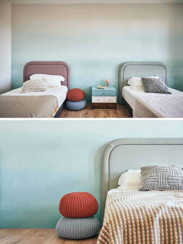 在卧室中,柔和的渐变色调墙营造出一种平静的感觉,灵感则来自景观。