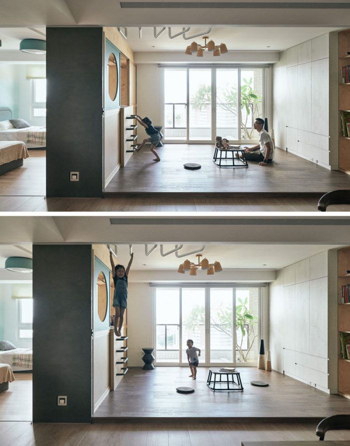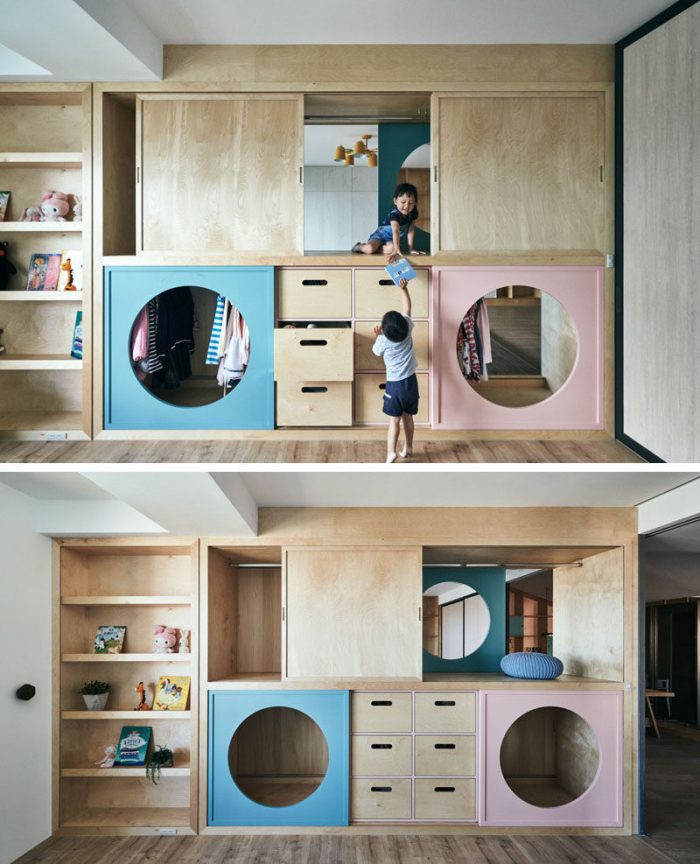 HAO Design have created a unique wardrobe that connects a play room with the children’s bedroom in this home in Kaohsiung city,Taiwan.