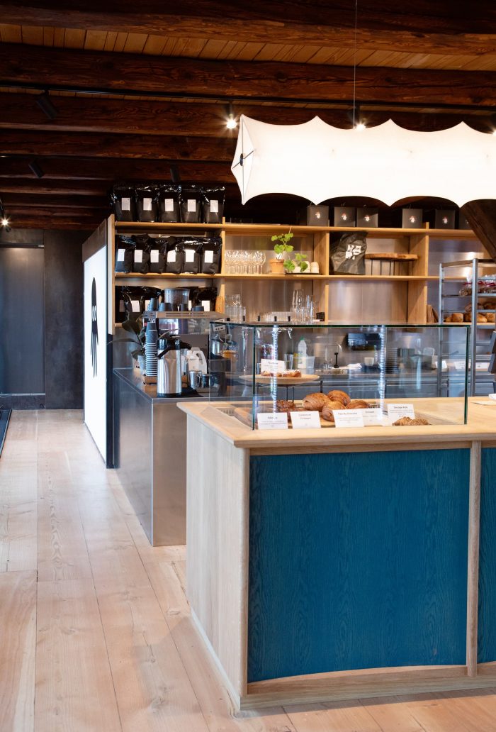 The wide bar is made of solid oak wood and treated with linseed oil. The shelves, tables, and chairs are designed by Spacon & X and are made in the same type of solid oak wood and were handcrafted by Nørrebros Snedkerservice to manifest local craftsmanship. The shelves behind the bar are specifically designed with an aluminum background to amplify the exposure of the bread on the shelf, as the material reflects the light that comes through the ample windows on each side of the building.