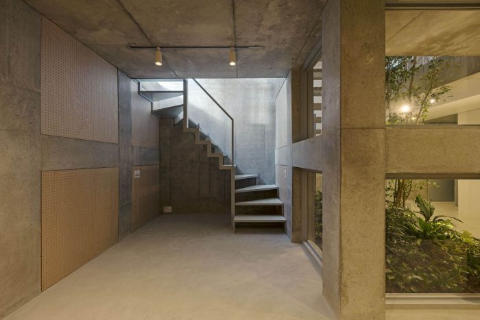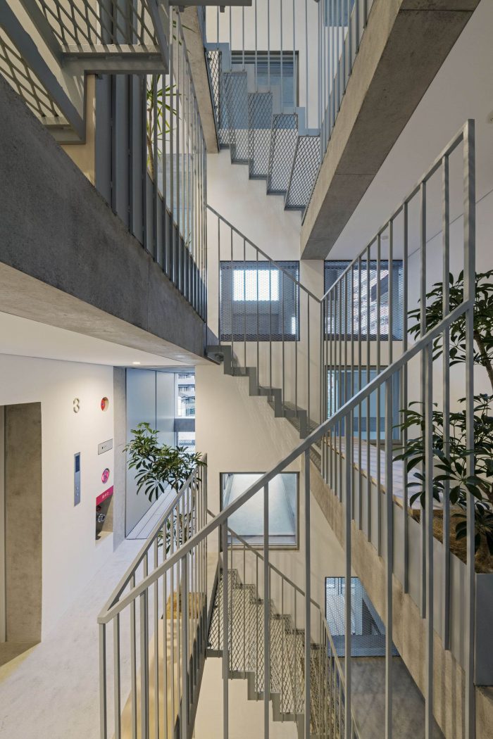 Meguri-doma. "Meguri-doma (a covered stairwell / common corridor)" is designed to hold sunlight and allow the breeze to flow through the inner terraces and living spaces. By doing so, the stairwell becomes a fluid space that has both indoor and outdoor atmospheres.