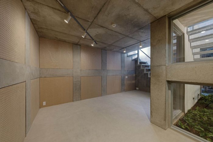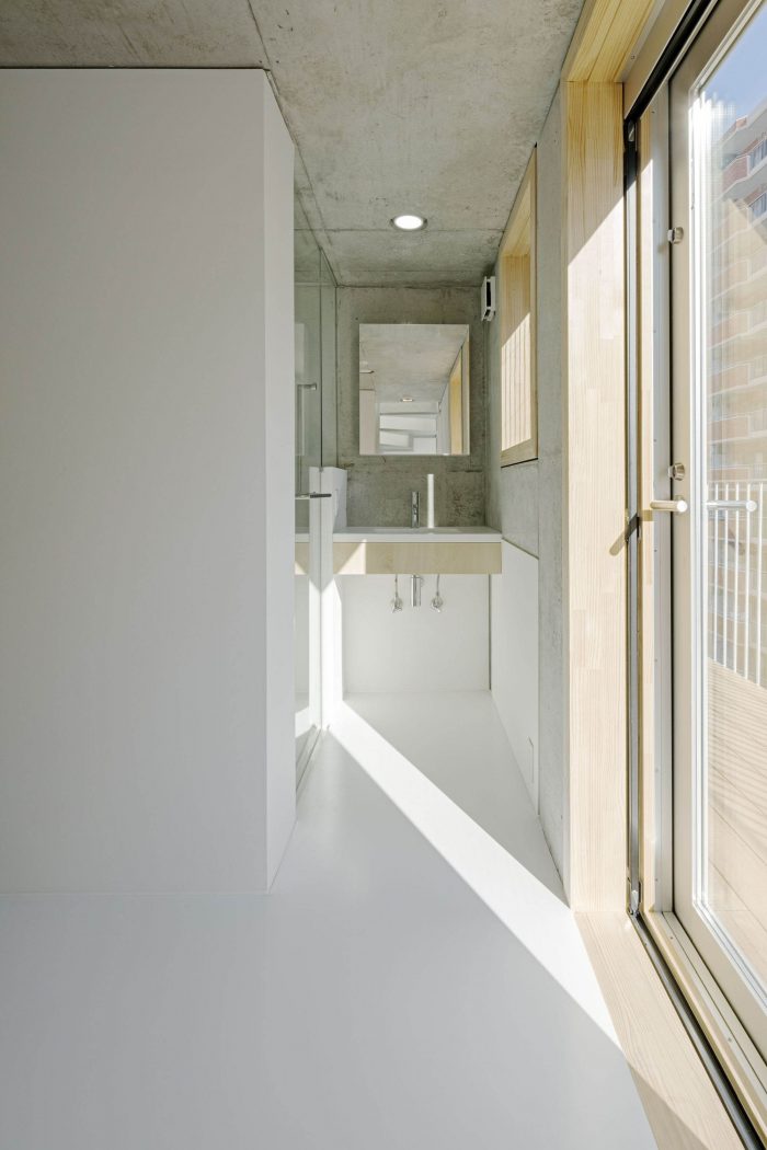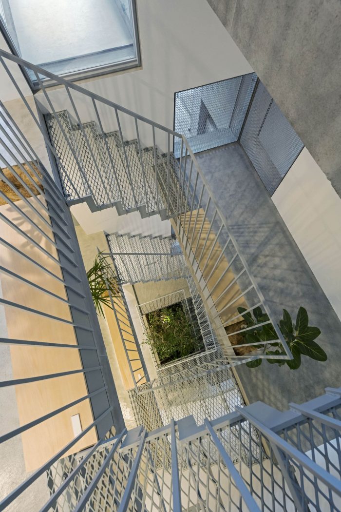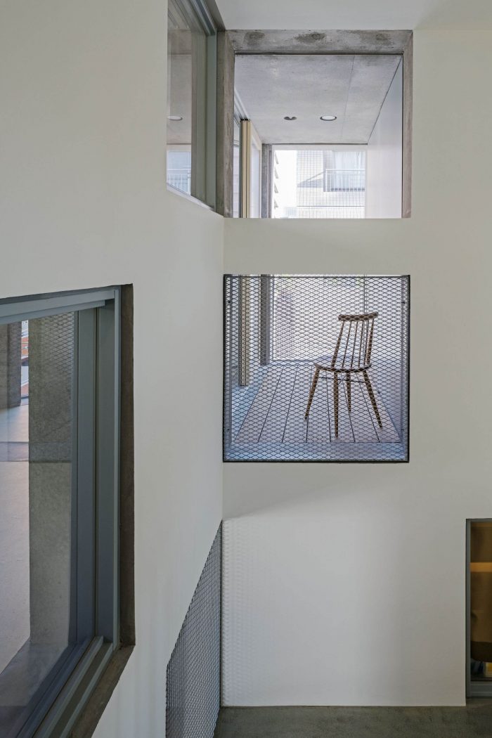 There is a bench in every landing area, which suggests alternative use of the space as a second living room or a study space. The communal terrace is equipped with an outdoor kitchen. Thirteen apartment units in various shapes, along with the shared spaces, form a multi-faceted volume, allowing residents to find a suitable space in the building for what they need at a particular moment.