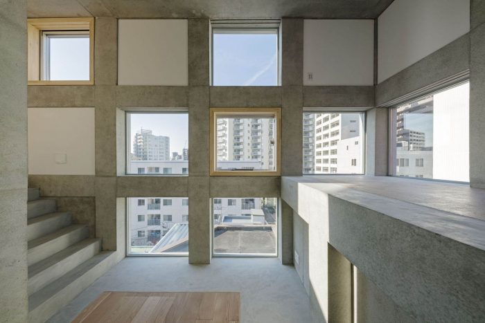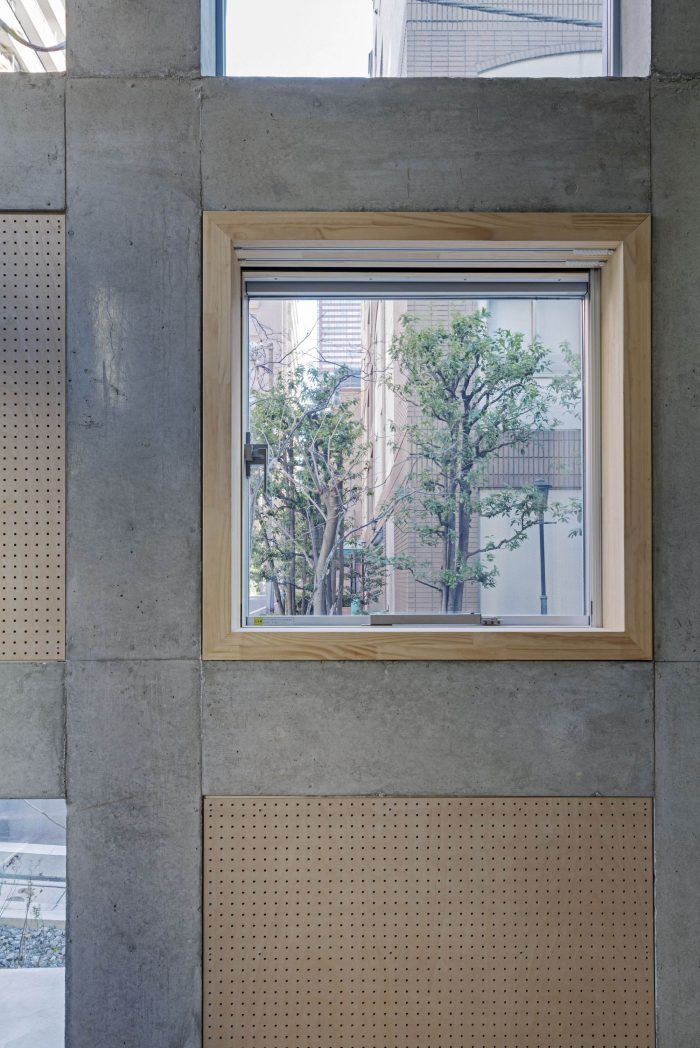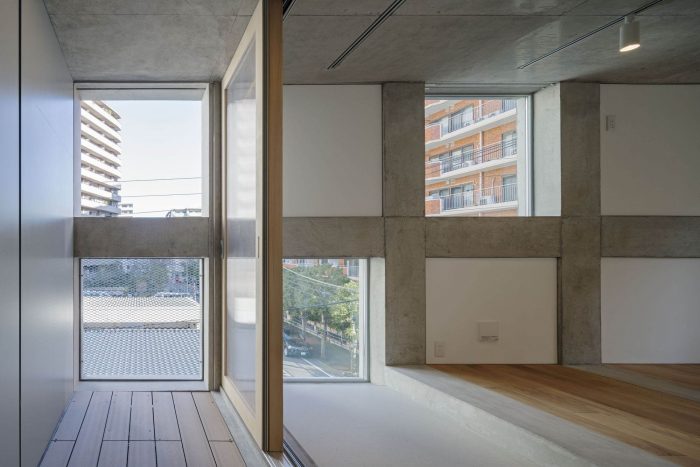 Mixing inside and outside. The site is situated amongst large-scale residential buildings along a major road and an area of low-rise wooden houses. Considering the high contrast of texture and sizes between these two areas, we gauged an intermediate structural scale: a frame built with 310mm square columns placed 1350mm apart. Set in the center of this simple structure, an open "Meguri-doma" connects all levels. "Open terraces, " "Inner terraces, " and "Living spaces" are placed around it in various patterns to mix inside and outside throughout the structure. We intended to add an airy feel to this layered net-like architecture.