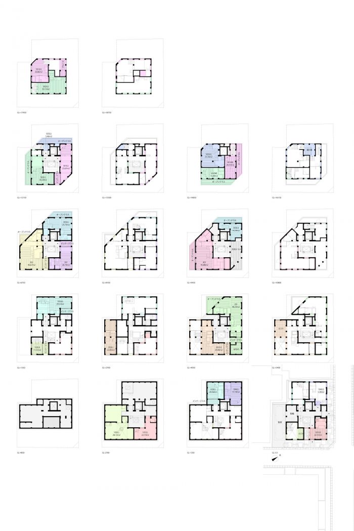 内部和外部的混合。该地块位于一条主干道上的大型住宅楼和一个低层木屋区之间。考虑到这两个区域之间质地和尺寸的高度对比,我们测算了一个中间的结构规模:用310毫米的方形柱子搭建一个框架,间隔1350毫米。在这个简单结构的中心,一个开放的 "Meguri-doma "连接着所有的楼层。"开放式露台"、"内部露台 "和 "生活空间 "以不同的模式放置在它的周围,以混合整个结构的内部和外部。我们的目的是为这个分层的网状建筑增加一种通风的感觉。