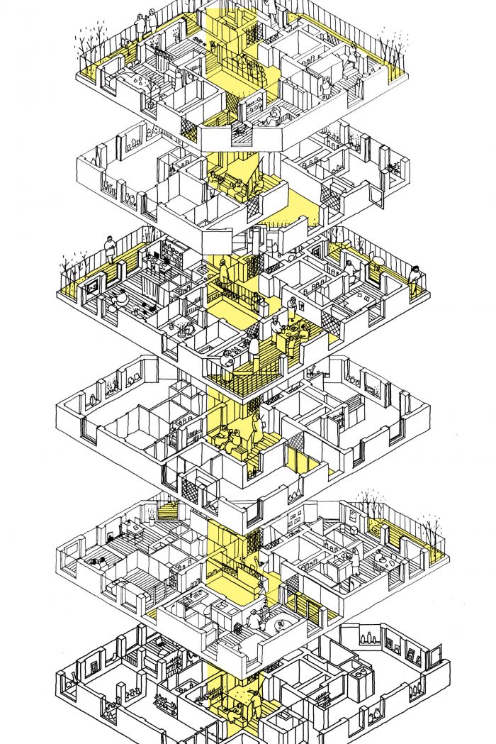 因此,我们提出了一个计划,即每个单元都有独特的平面图,可以作为出租单元提供,也可以作为家庭住宅的 "独立房间 "对待,而不是供全家人共同居住的住宅。在这个非等级化的计划中,家庭可以从一个单元搬到另一个单元,这取决于他们在未来过渡时需要的空间类型。