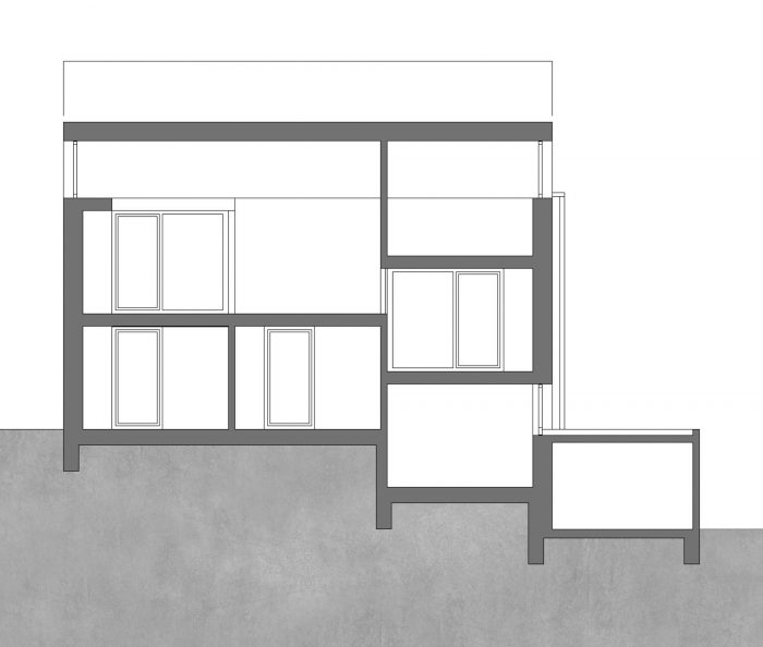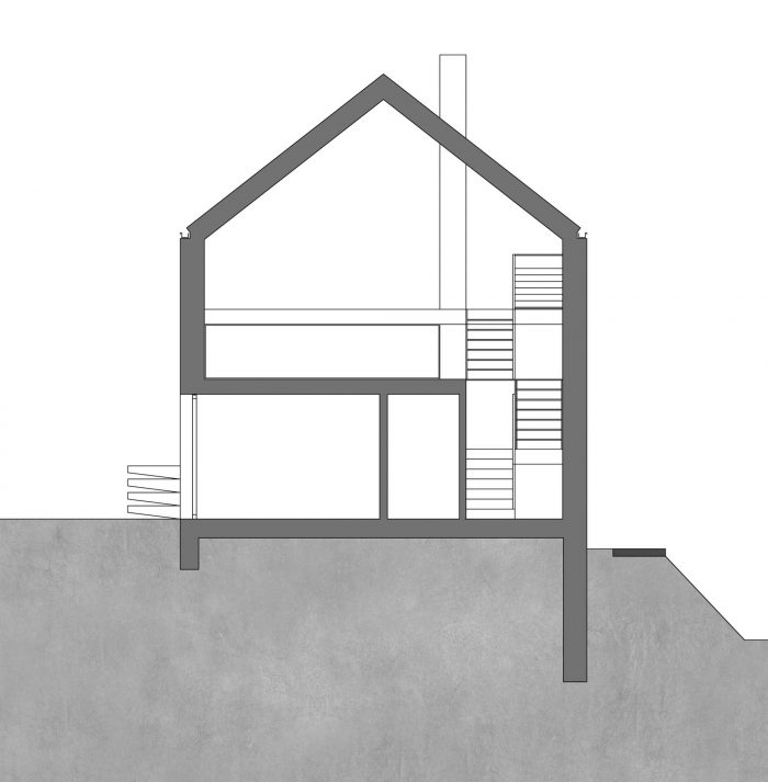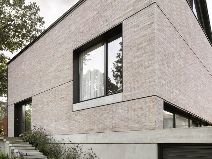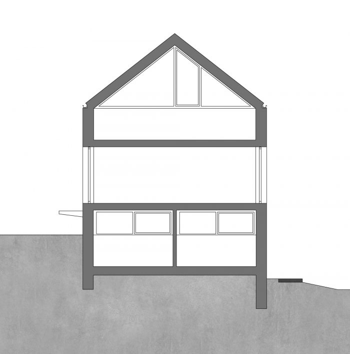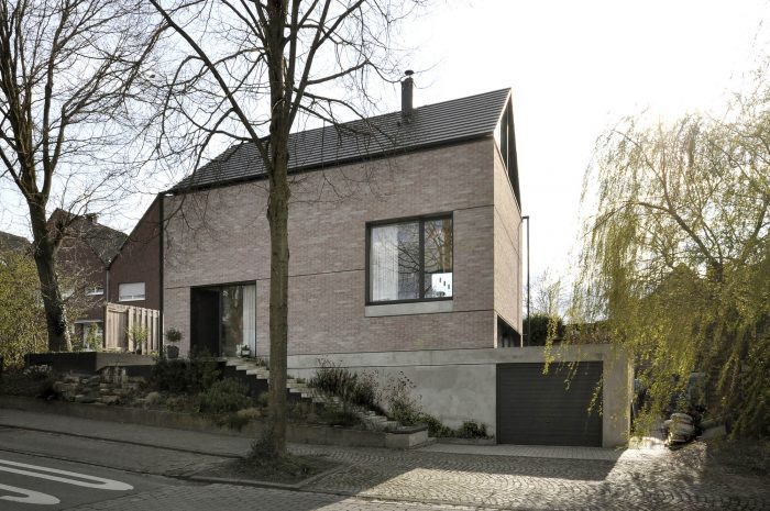 Havixbeck is a small village close to Münster/Westfalen. The site near the center is the former garden area of the adjacent apartment house, which was not in use by the inhabitants. Because of the sloping terrain and difficult building regulations, it was long for sale. The development plan set the cubature of the building and the materials to be used. The design fits all regulations but interprets the traditional gable roof house in a modern way as a sequence of abstract, interlocking shapes. These are - in traditional order - placed upon a concrete base building and topped by a light roof construction with fully glazed fronts to both sides. The house is designed as a spilt-level building with five levels plus a garage and fits perfectly into the existing terrain. The internal organsation is made visible in the facade with room-high glazings.