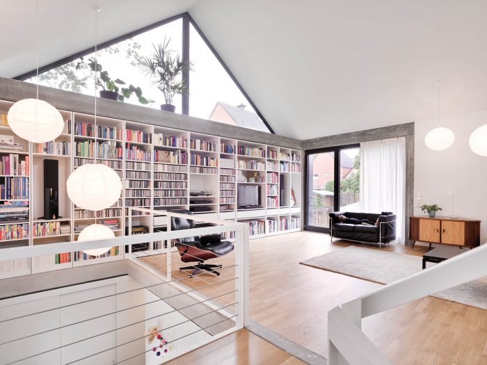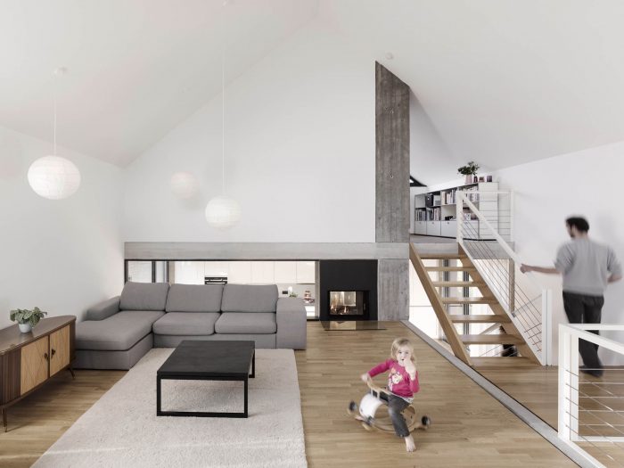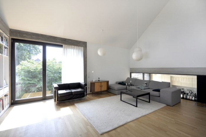 The living room is the center of the house, all other areas are more or less directly connected to it. Through its location in the upper part of the building it encloses the whole space underneath the roof. It is open to all directions as well as upwards and downwards and benefits of different natural lighting throughout the whole day.