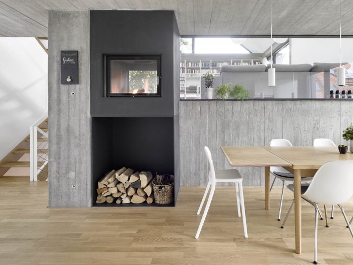 The kitchen is fully glazed to the front- and backside of the building. Outdoor steps over half a storey connect it to the garden. The storey-high fireplace is openable both to the kitchen and living room.