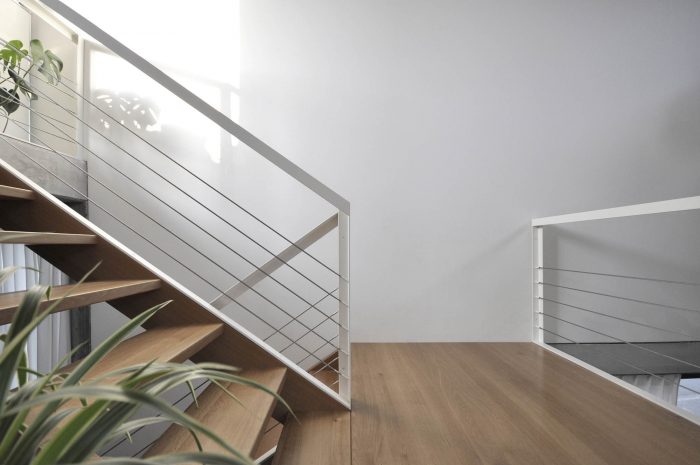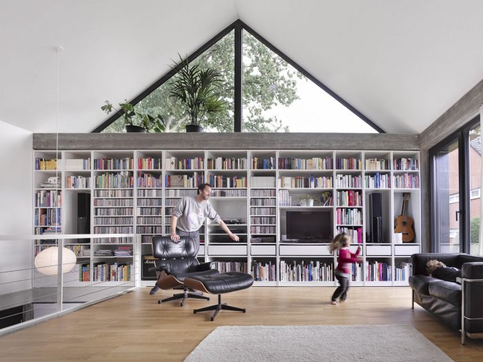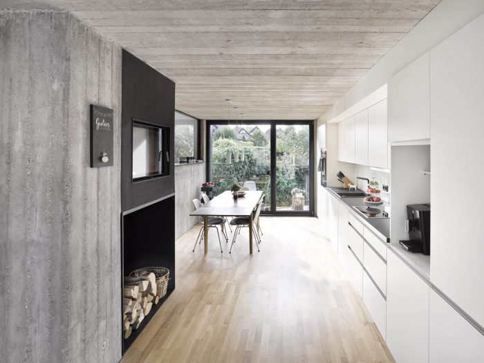 All private rooms are located on the two lower levels: two child´s rooms, the bedroom, bathroom and a guest toilet. Entering the building one will instantly experience its spatial concept: all non-private areas are organized in one generous open space. The kitchen, living room, and workspace are only divided by their different levels.