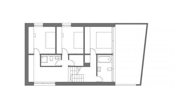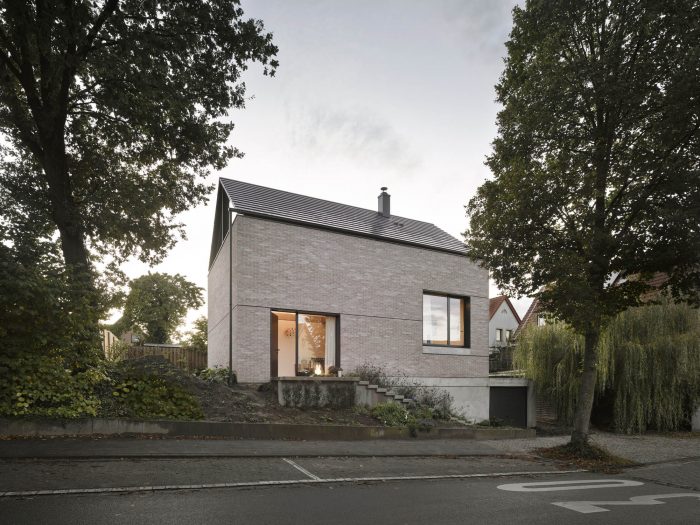 Havixbeck是一个靠近明斯特/西法伦的小村庄。靠近中心的场地是邻近公寓房的前花园区,居民没有使用。由于倾斜的地形和困难的建筑法规,它被长期出售。开发计划规定了建筑的立方体和要使用的材料。该设计符合所有的规定,但以现代的方式解释了传统的屋檐式房屋,作为一个抽象的、互锁的形状序列。这些形状按照传统的顺序被放置在一个混凝土基座上,顶部是一个轻质的屋顶结构,两边都是全玻璃的正面。这座房子被设计成一个有五层和一个车库的倾斜式建筑,与现有的地形完美地结合在一起。内部结构在外墙中以房间高的玻璃窗显现。