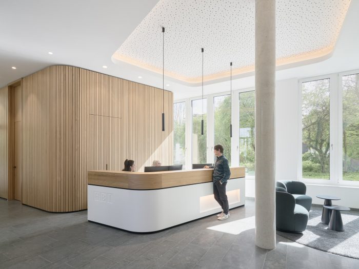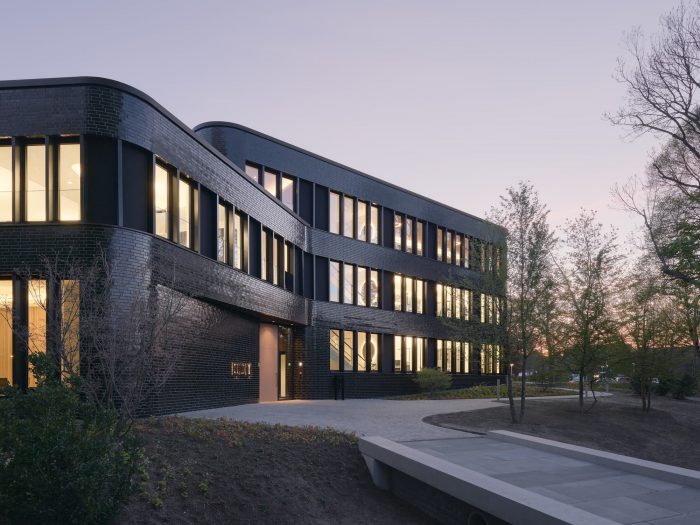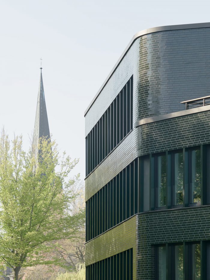 As a basic volume similar to an angled Y, the building formulates a welcoming gesture on the entrance side, while aligning with the prominent view axis of the St. Petri Kirche. The HBI office is accessed via a bridge across the Schiffergraben. The forecourt is paved with old basalt stone and offers seating and bicycle parking. Following the topography of the site, the entrance level is designed as a split level with airy room heights in the foyer and meeting area. The use of few, high-quality materials such as natural oiled oak, polished green-grey Anröchter sandstone, in combination with muted white walls and a well thought-out lighting concept, grants the interior an inviting atmosphere. While the facade is given a glossy finish with glazed bricks, the interior is made exclusively of materials with matte surfaces.