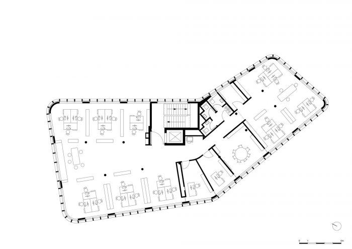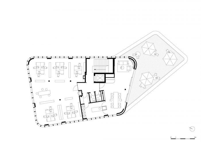 动态的内部空间,已经被建筑结构所塑造,并由天花板上的光线凹槽加以补充。光线充沛的房间可以看到郁郁葱葱的绿色和Buxtehude的老城区,确保了特殊的工作场所。通过灵活的房间分区,可以实现从蜂窝式办公室到开放空间办公室的不同布局。二楼是员工的厨房和休息室,以及一个近100平方米的大型阳光露台。