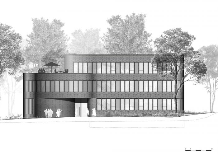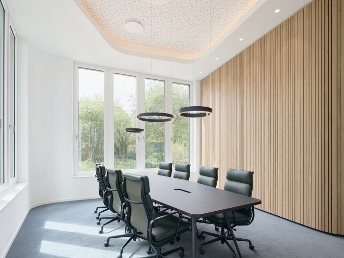 The dynamic interior spaces, which are already been shaped by the building structure, are complemented by light coves in the ceiling. Light-flooded rooms with a view into the lush green and the old town of Buxtehude ensure exceptional workplaces. Enabled by a flexible room zoning it’s possible to implement different layouts ranging from cellular offices to open-space offices. The 2nd floor houses a kitchen and lounge for the employees, as well as an almost 100 m2 large, sunny terrace.