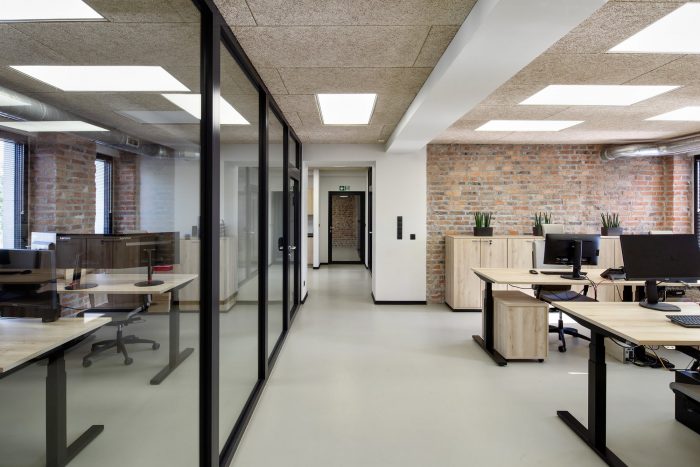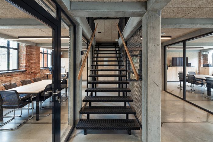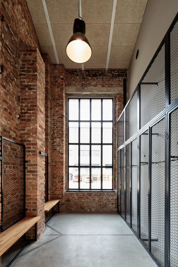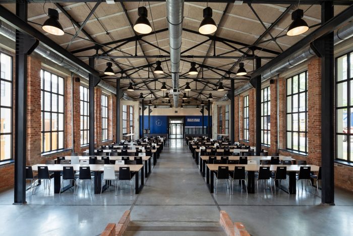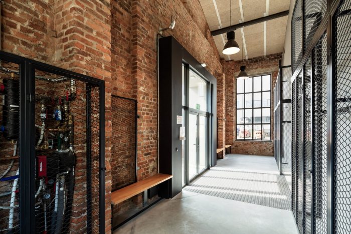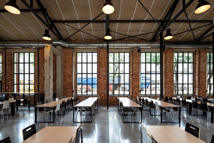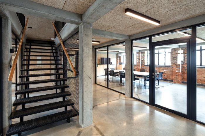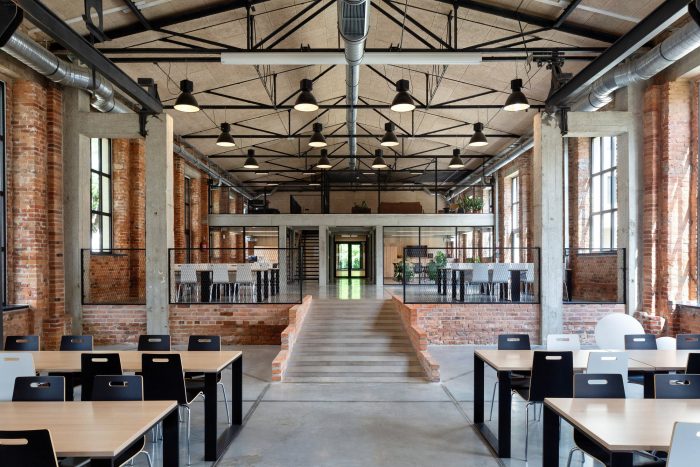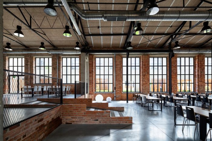 The entrances and the staircases were covered with corten steel, while the rest of the buildings are kept in neutral white and gray colors. The layout of the windows was kept true to its original form. Walls and roofs were thermomodernizated. Interiors are designed in loft style, with exposed brick, concrete, and terrazzo coupled with new elements with a black finish. Wall separating the canteen from the office building and all ceilings were covered with acoustic panels made out of natural materials. Ductwork and engineering details were exposed. Furniture is kept minimalistic to complement the style. The refurbishment will be continued in the next stages.