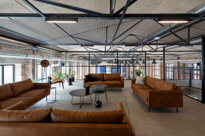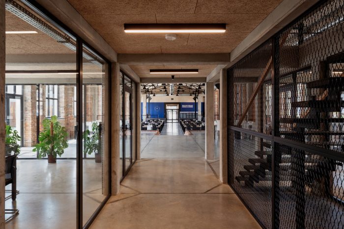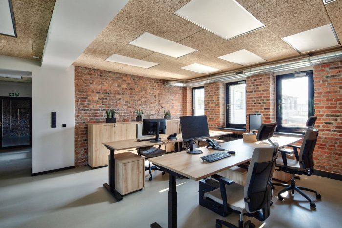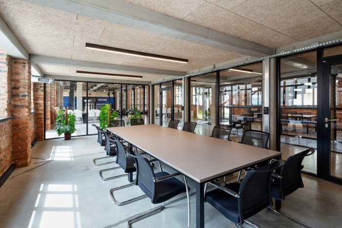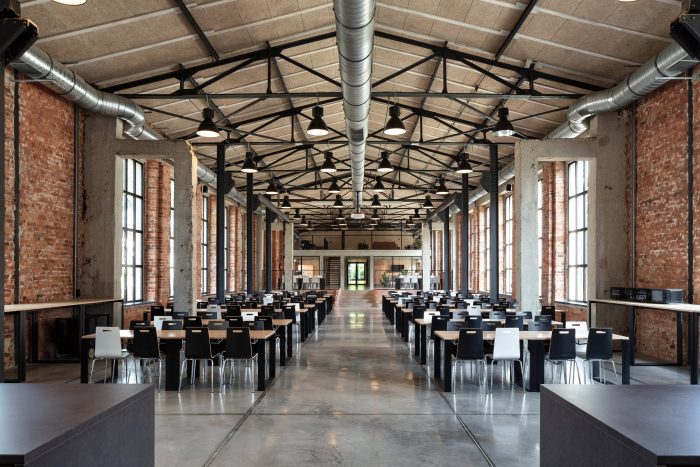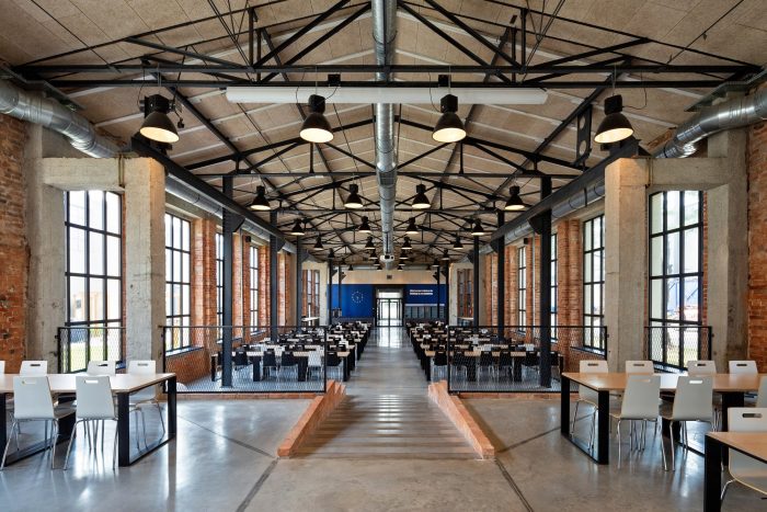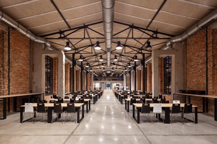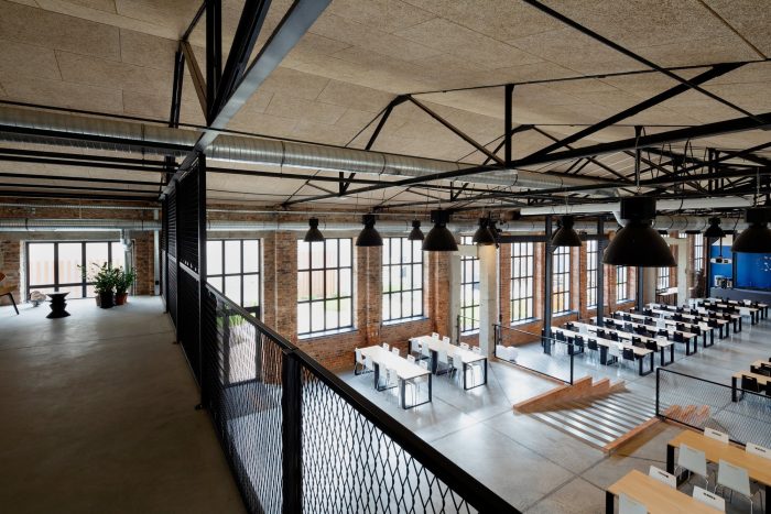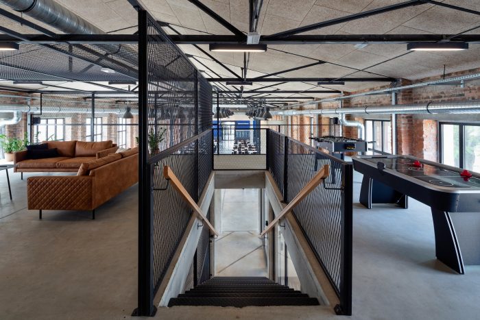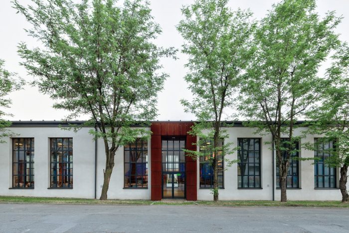 The entrances and the staircases were covered with corten steel, while the rest of the buildings are kept in neutral white and gray colors. The layout of the windows was kept true to its original form. Walls and roofs were thermomodernizated. Interiors are designed in loft style, with exposed brick, concrete, and terrazzo coupled with new elements with a black finish. Wall separating the canteen from the office building and all ceilings were covered with acoustic panels made out of natural materials. Ductwork and engineering details were exposed. Furniture is kept minimalistic to complement the style. The refurbishment will be continued in the next stages.