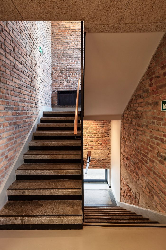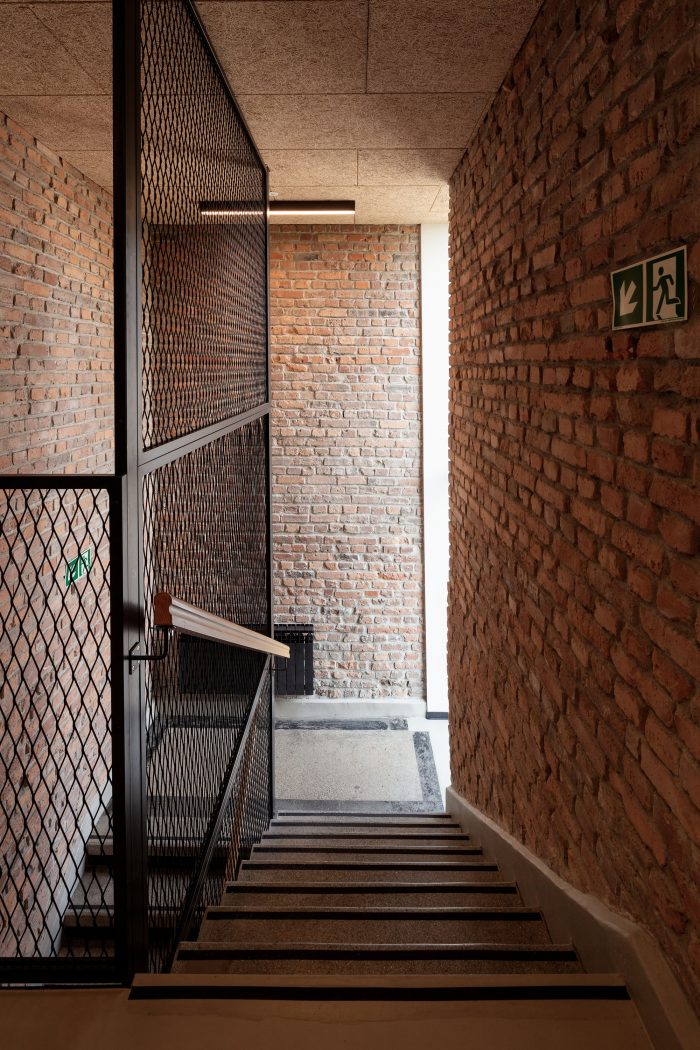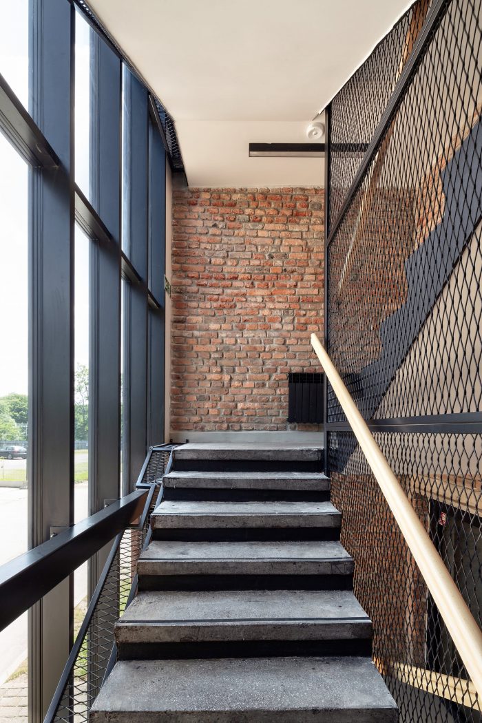 The main idea was to maintain material honesty, find simple design solutions and keep as many of the original building structures as possible. Brick walls were revealed, existing staircases finished with terrazzo got renovated, while the designed corten steel panels used on the facade were made out of unused stock of the company's steel and were entirely manufactured by the client. Its corten steel facade was made based on an executive project prepared by architects to make essential use of old-stored materials.