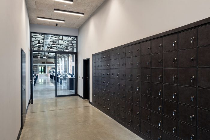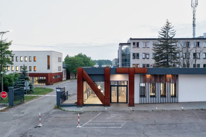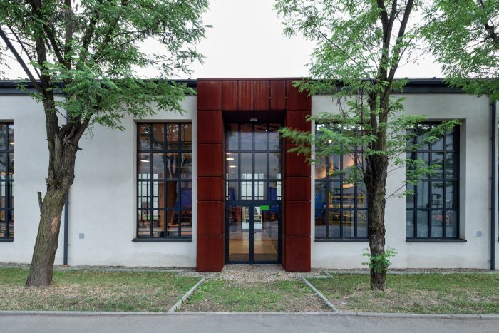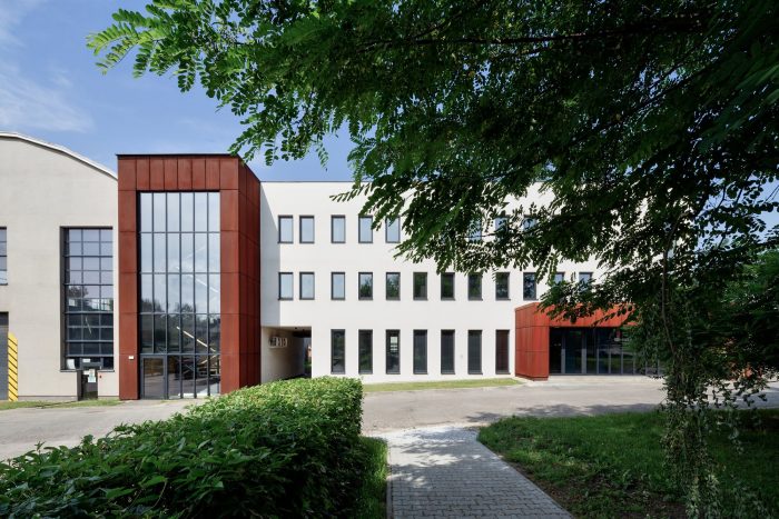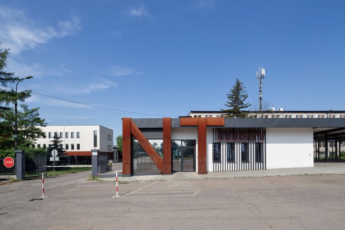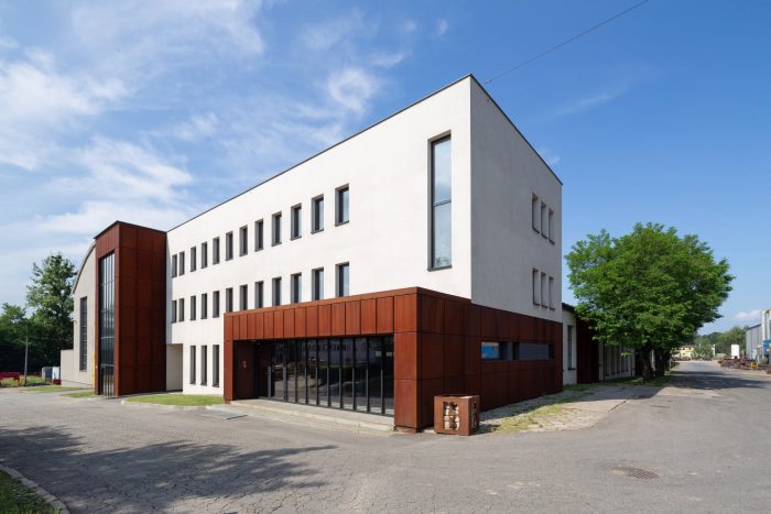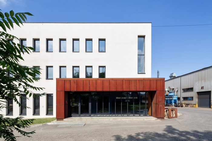 Therefore, the idea of zero waste was implemented into the design. The aforementioned gatehouse that was the target of the first stage, encompasses the entrance area of the entire complex and consists of two sections: a glazed building for security personnel with a waiting room for drivers and a cycle shelter. Corten steel was also used to mark the company name. The refurbished office building offers over 740m2 of flexible open office space with smaller box offices and conference rooms.