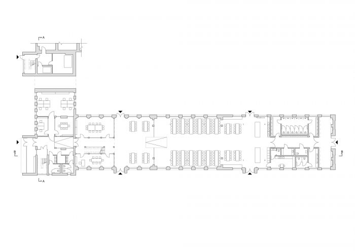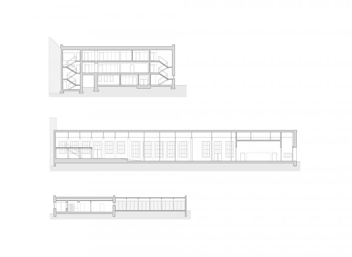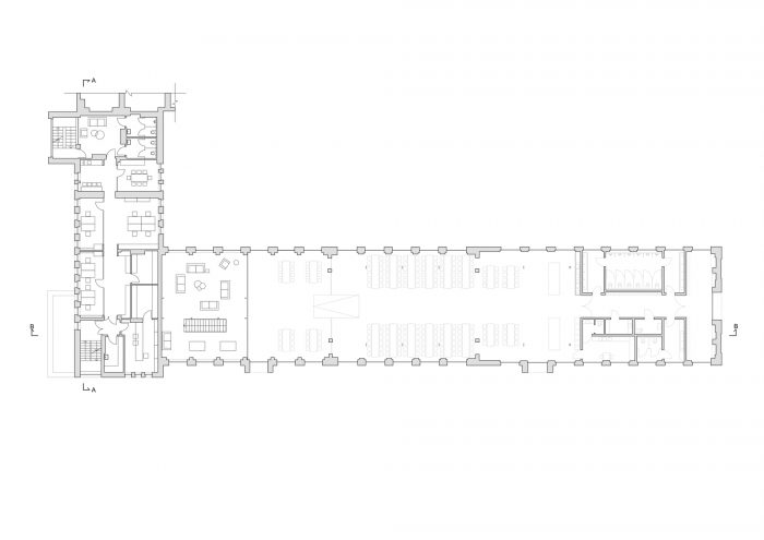 入口和楼梯都用皮质钢覆盖,而建筑的其他部分则保持中性的白色和灰色。窗户的布局保持了其原有的形式。墙壁和屋顶进行了热现代化改造。室内设计为阁楼风格,裸露的砖块、混凝土和水磨石加上黑色表面的新元素。将食堂与办公楼隔开的墙和所有天花板都用天然材料制成的吸音板覆盖。管道系统和工程细节被暴露出来。家具保持简约,以补充风格。翻新工程将在接下来的阶段继续进行。