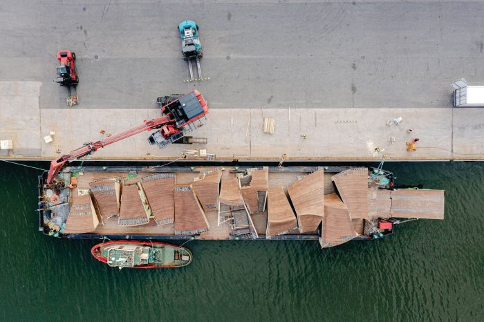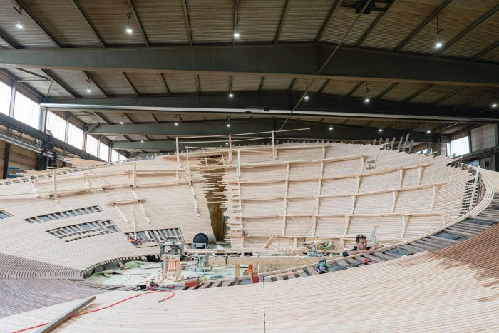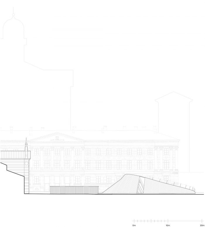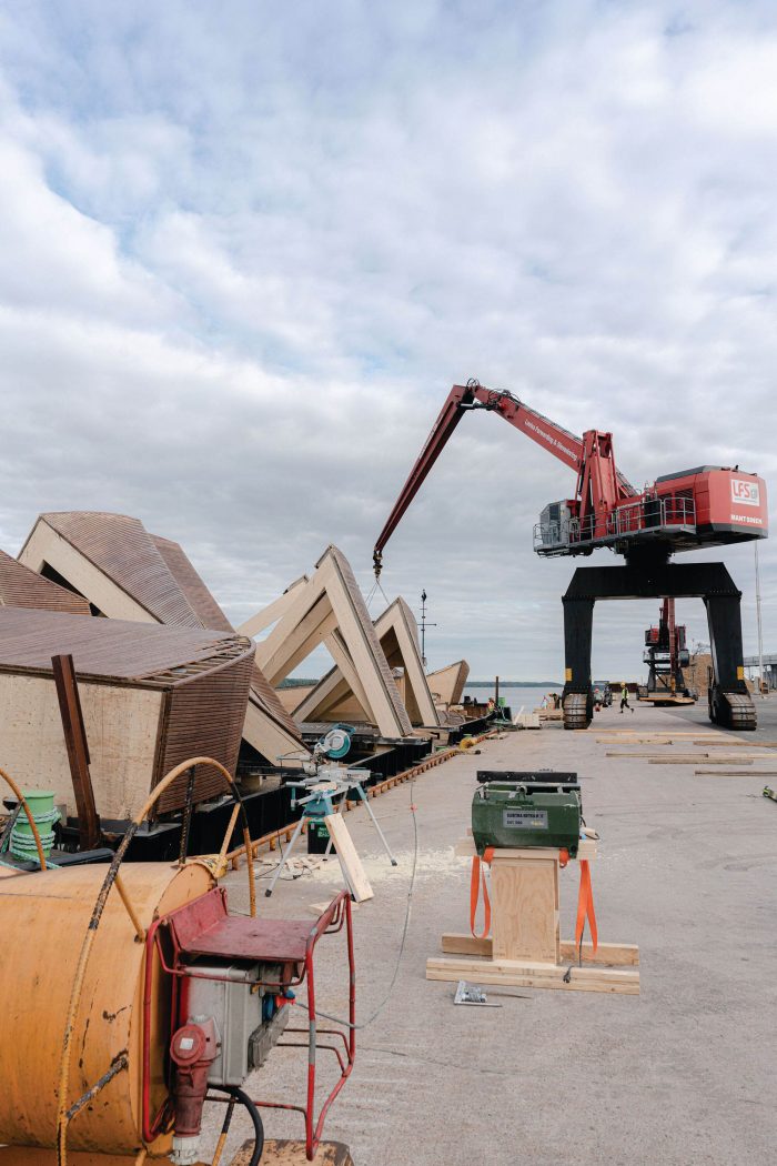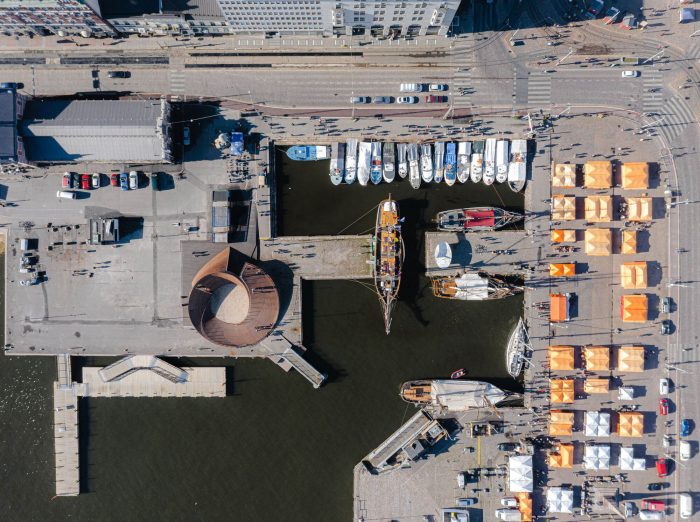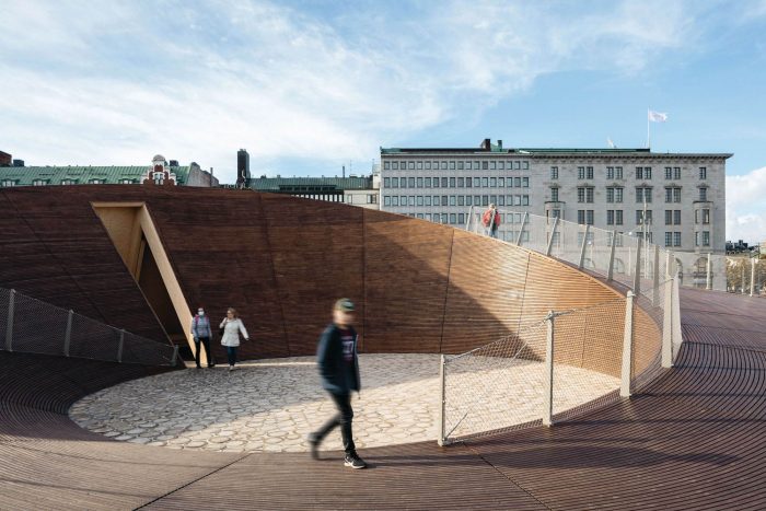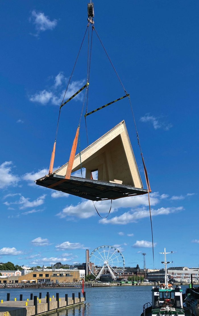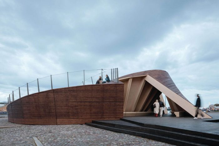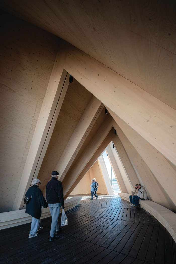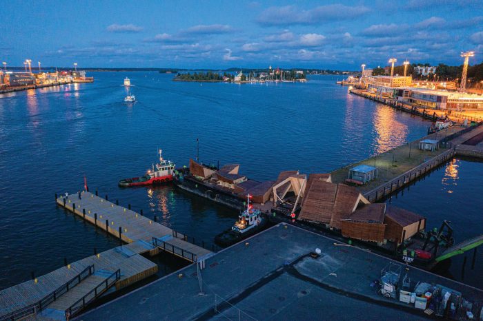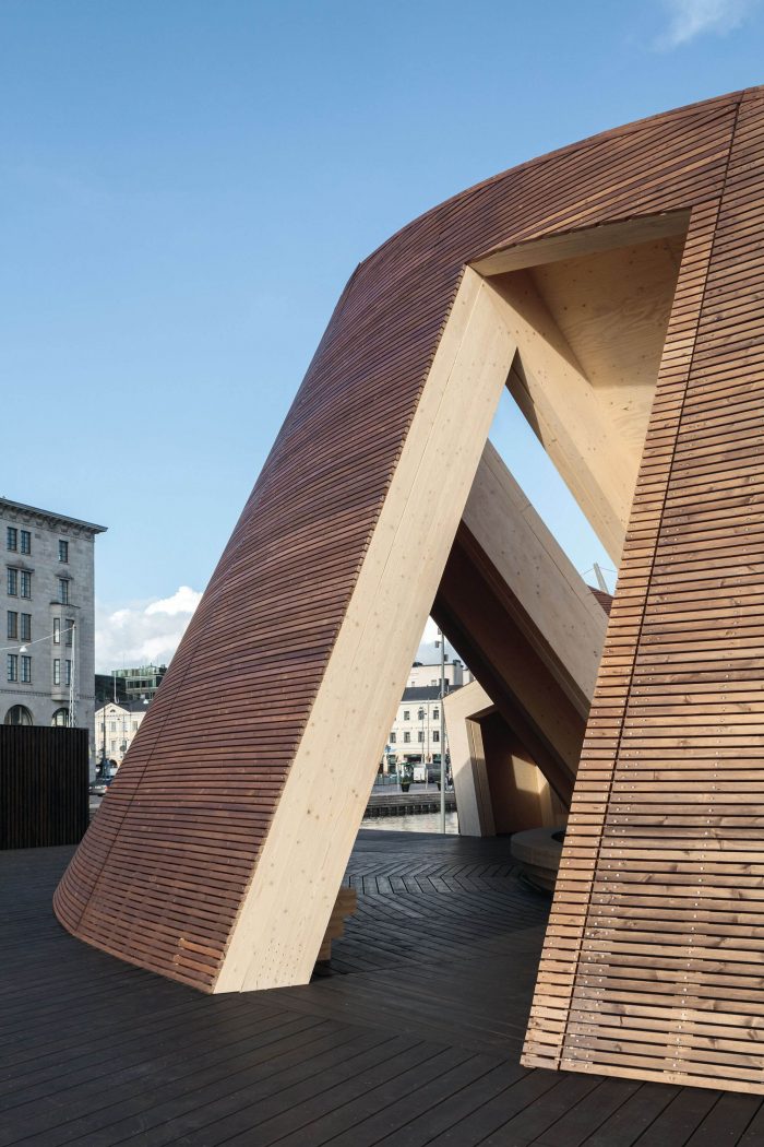 The pavilion was designed to provide an anchor point for the event in the city. As a wooden “vessel” it enters a dialogue with the ships in the harbor and ties in with the history of the Market Square. At first, the intention was to have the pavilion dismantled after each Biennial and to have it shipped in pieces to Vallisaari to be stored there for the winter.